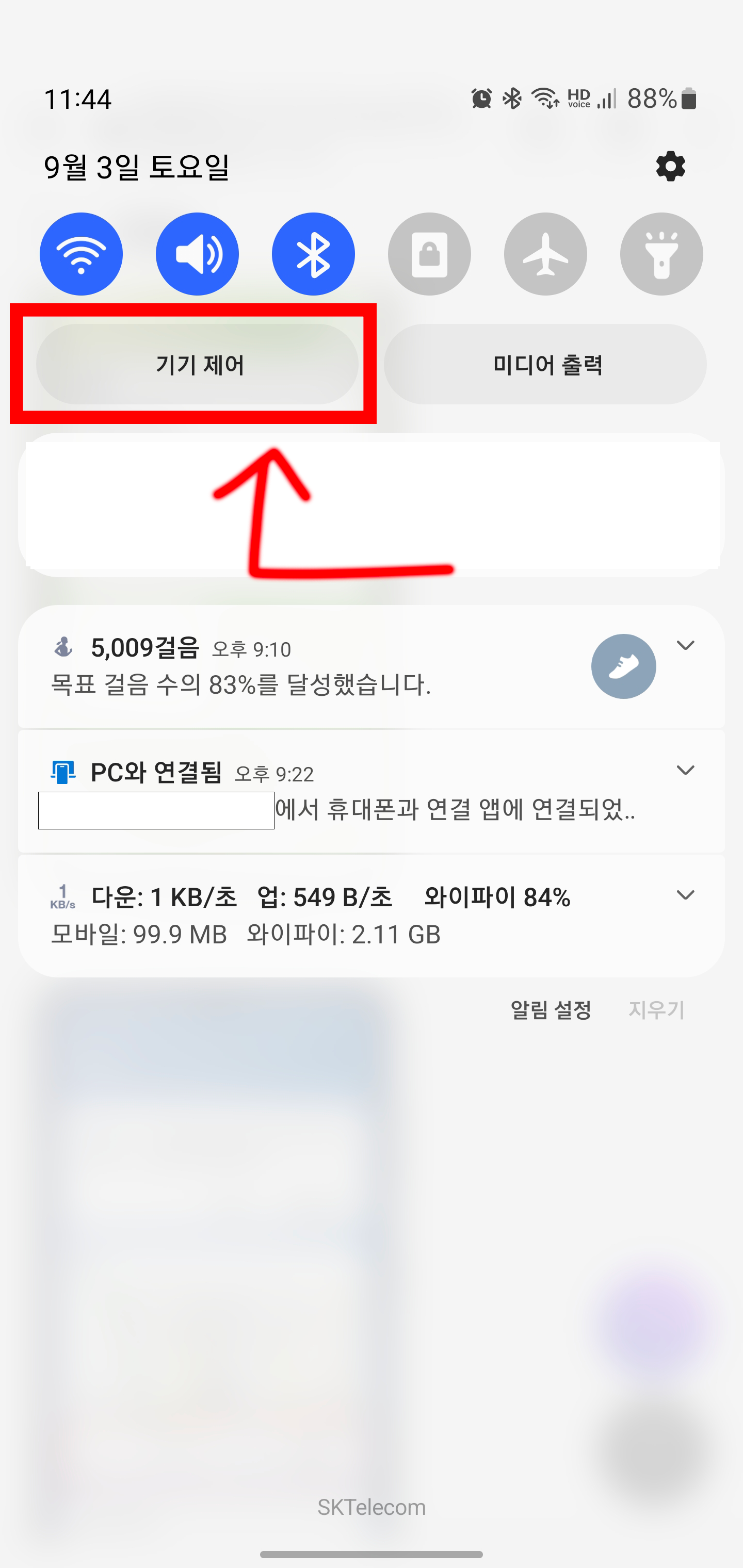 1. 갤럭시 스마트폰의 상태바에서 "기기 제어" 클릭