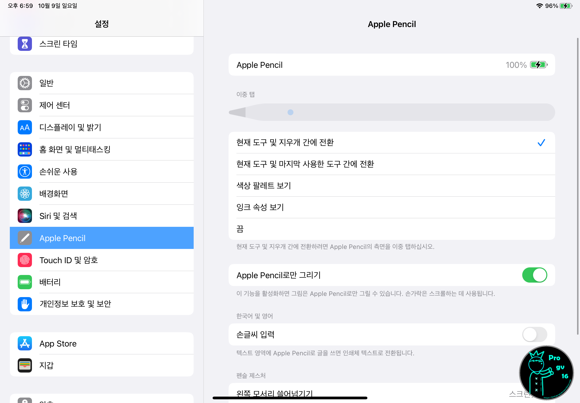 아이패드 자체 설정에 들어가셔서 Apple Pencil 옵션 -> 이중 탭 (기본: 현재 도구 및 지우개 간에 전환)을 누르시면 됩니다. 이 설정 외에 다른 부분은 옵션에 따라 본인이 원하는 대로 설정하셔도 무방하고요. 어이없게도 이 설정 (Apple Pencil) 항목을 살펴보지 않아서 해메였던 분들은 해결이 되었으면 좋겠습니다.