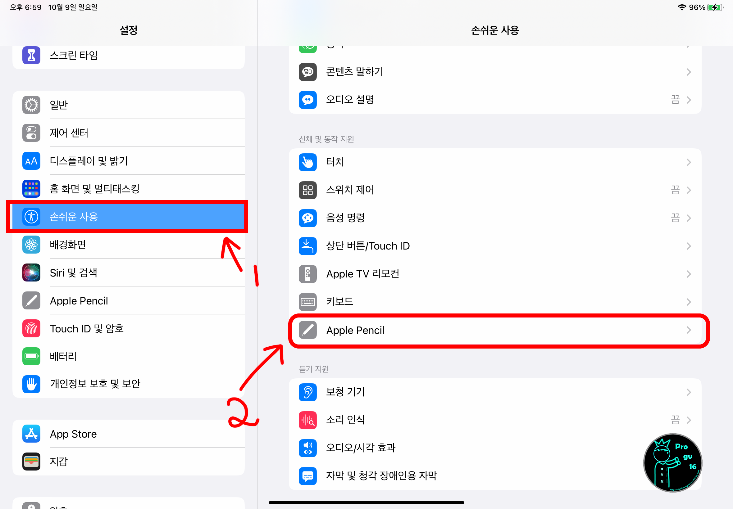 물론 개발자 옵션처럼 연속으로 눌러서 활성화하는 건 아니고, 손쉬운 설정에 들어가셔서 "신체 및 동작 지원" 항목에 있는 "Apple Pencil" 항목을 눌러주시면 됩니다.