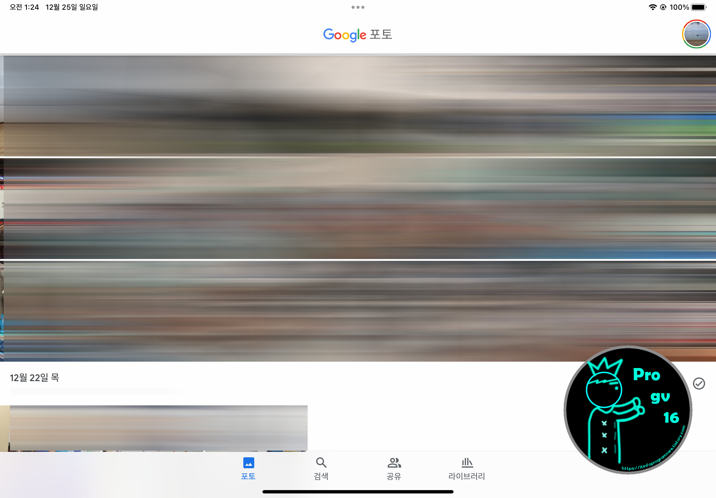 다음은 IOS입니다. 아래 사진에는 아이패드를 스크린샷 한 것으로 iPadOS이기는 하지만 iOS도 환경 및 기능상 모두 동일할 것이라고 보며 앱을 살펴보도록 하죠. 구글 포토 메인입니다.