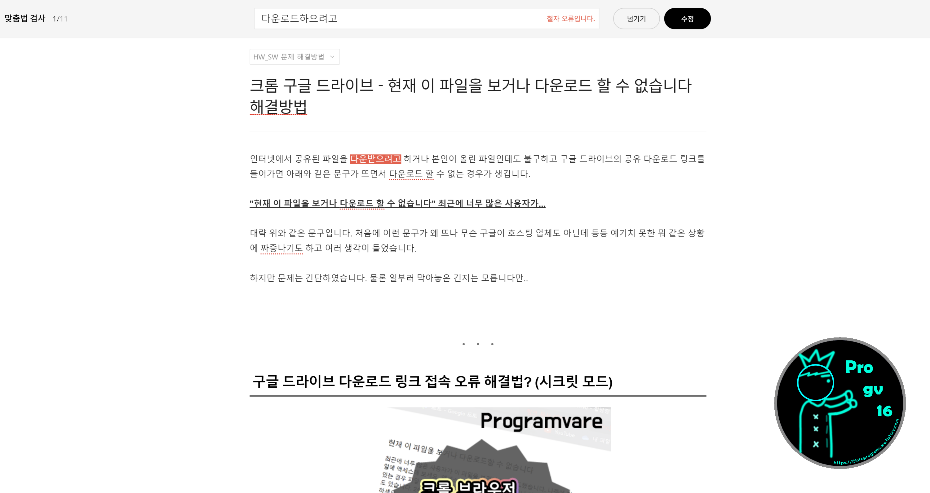 맞춤법 검사 자동수정 -> 다운로드하으려고