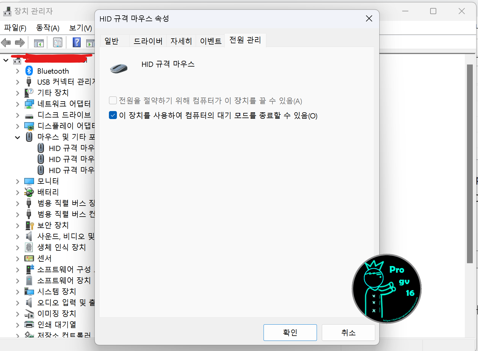 장치관리자에서 "이 장치를 사용하여 컴퓨터의 대기 모드를 종료할 수 있음" 옵션을 해제합니다. 블루투스 기기들이나 연결된 USB들이 반응을 일으켜서 PC의 절전모드가 강제적으로 해제될 수 있다는 의견이 보였습니다.