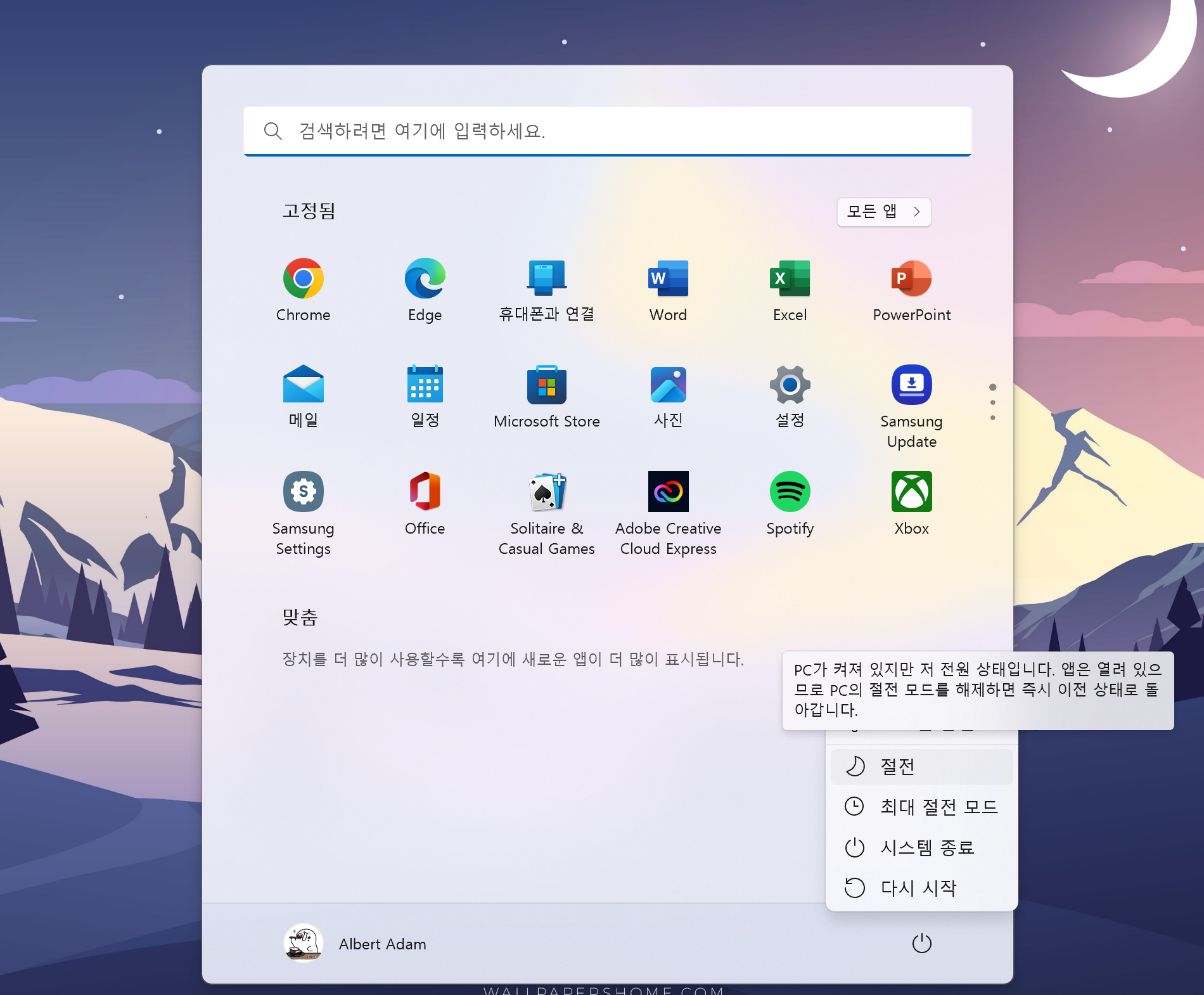 사실 여러번 시도해보기 전 절전모드 외 시스템적으로 꼬인 것 같아서 갤럭시북 자체에 내장되어 있는 삼성 리커버리 솔루션에 있는 백업 이미지로 초기화를 돌려보았었고 윈도우11로 업그레이드 하였습니다 (윈도우10에서도 안되던 것은 동일함)