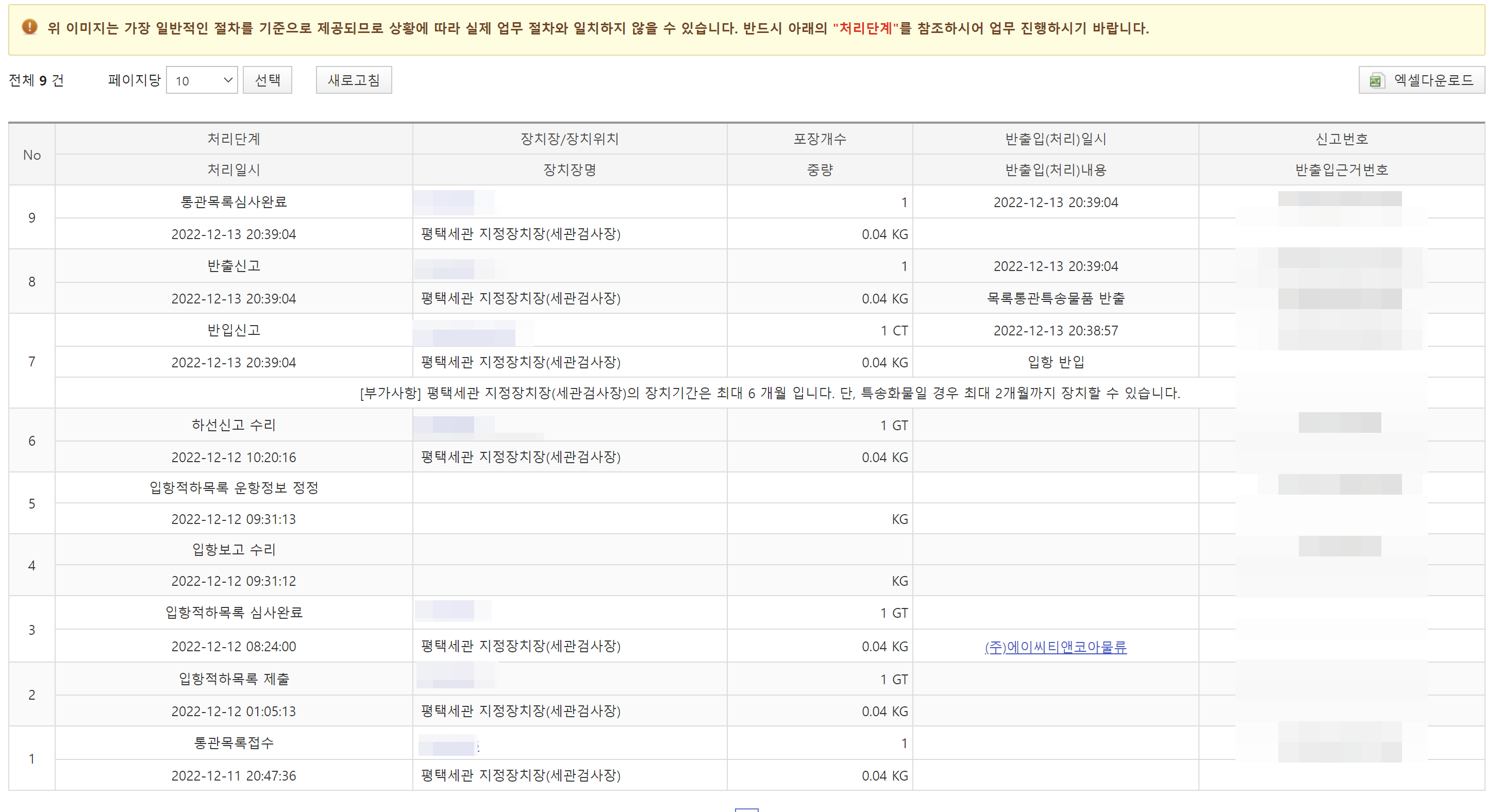 다음은 국내 유니패스의 통관과정 조회입니다. 12월 11일날 중국에서 한국 관세청으로 물류 신고를 한 다음에 물품의 실제 도착일은 12월 12일. 그리고 통관 완료일은 12월 13일로 나름 빠르게 진행되었습니다. 통관도 빠르게 되었겠다 이제 기다리고 있었습니다. 국내 일반우편으로 처리되니까 곧 오겠지.