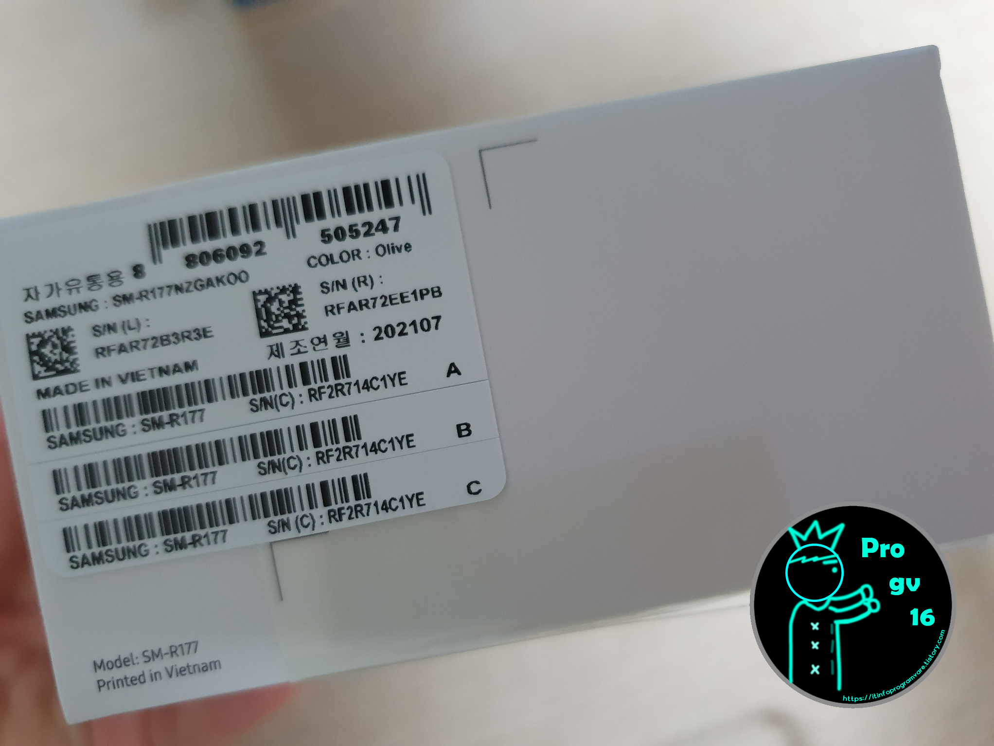 그걸 믿고 저는 바로 개봉 하였는데요. 제조연월일을 확인해보지도 않고 개봉부터 하였습니다 (이미 반품은 물 건너감) 나중에야 부정적인 리뷰들이 생각나서 갤럭시버즈 박스에 붙어있는 제조일자를 확인해 보았는데요. 2021.07월이었습니다. 이제 조금만 있으면 2년이 방치된 상품이라는 생각에 이게 맞는건가? 라는 생각도 들었습니다.