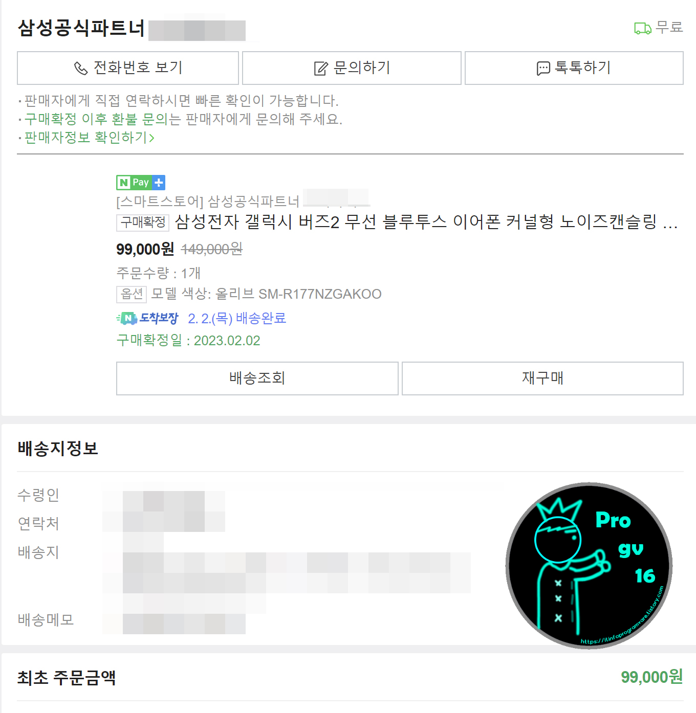 아래 이미지는 갤럭시버즈2 올리브 색상 구매내역입니다. 네이버 도착보장제도와 삼성공식파트너이기 때문에 다른 곳에서 사서 고생하지 말고 믿을만한 곳이라고 보이는 사이트에서 구매하였습니다.