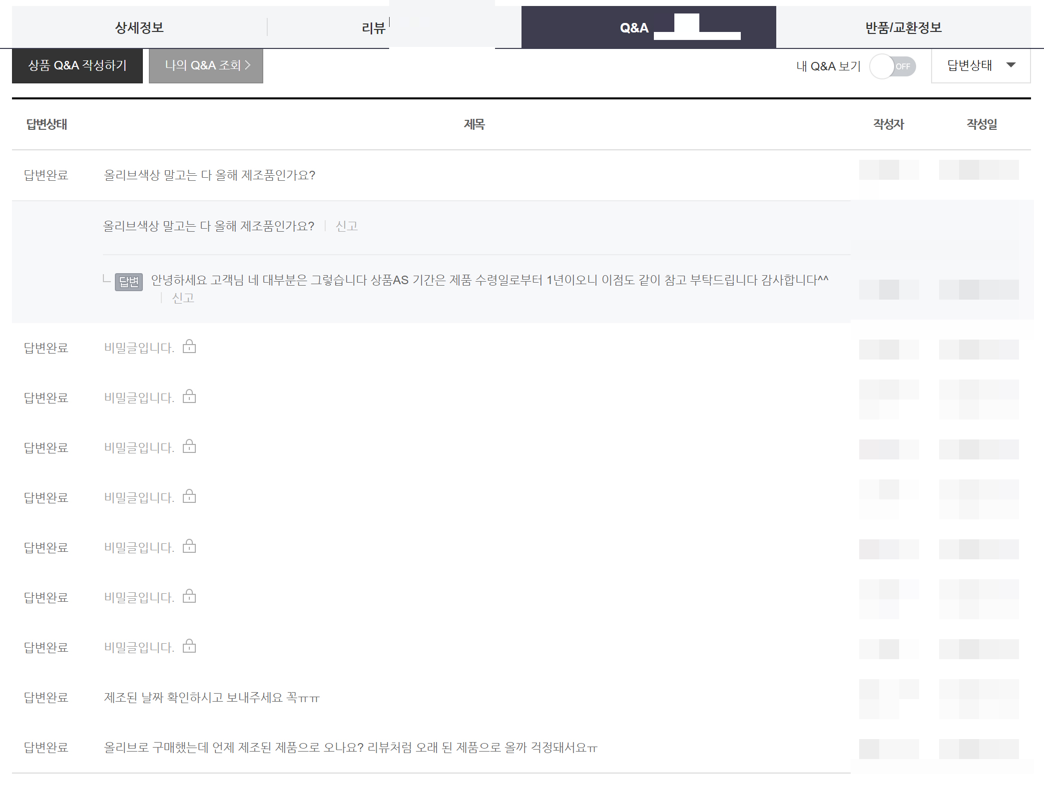 물론 위의 이미지와 같이 제조일자를 확인 안한것도 아니고 상세페이지 및 리뷰들도 모두 참고한 상태로 구매하였습니다. 하지만 만일의 상황을 모르고 주문하고 Q&A를 보지 않은 제 잘못도 있을 것 같습니다.