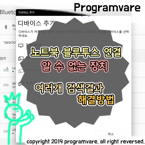 물론 간헐적으로 한 두개 뜨는 정도는 문제없지만 정작 검색하려는 기기는 늦게 뜨거나 뜨지 않고 서너 개가 도배되는 수준으로 장치목록에 검색되면은 문제가 있는 것이죠. 대부분은 드라이버 충돌이 원인입니다.