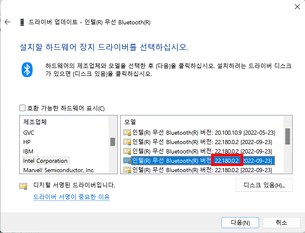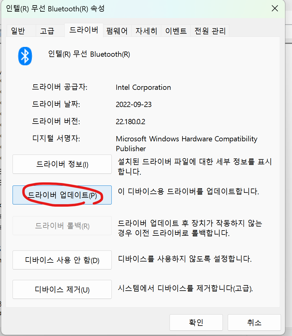 <참고로 제조사 드라이버와 일치하지 않는 경우에는 제조사에서 최신으로 배포한 블루투스 드라이버 버전일수도 있어서 기존에 오류가 있는 블루투스 드라이버를 제거한 뒤, 공식 사이트에서 블루투스 드라이버를 다운로드하고 설치하는 것을 권장드립니다>