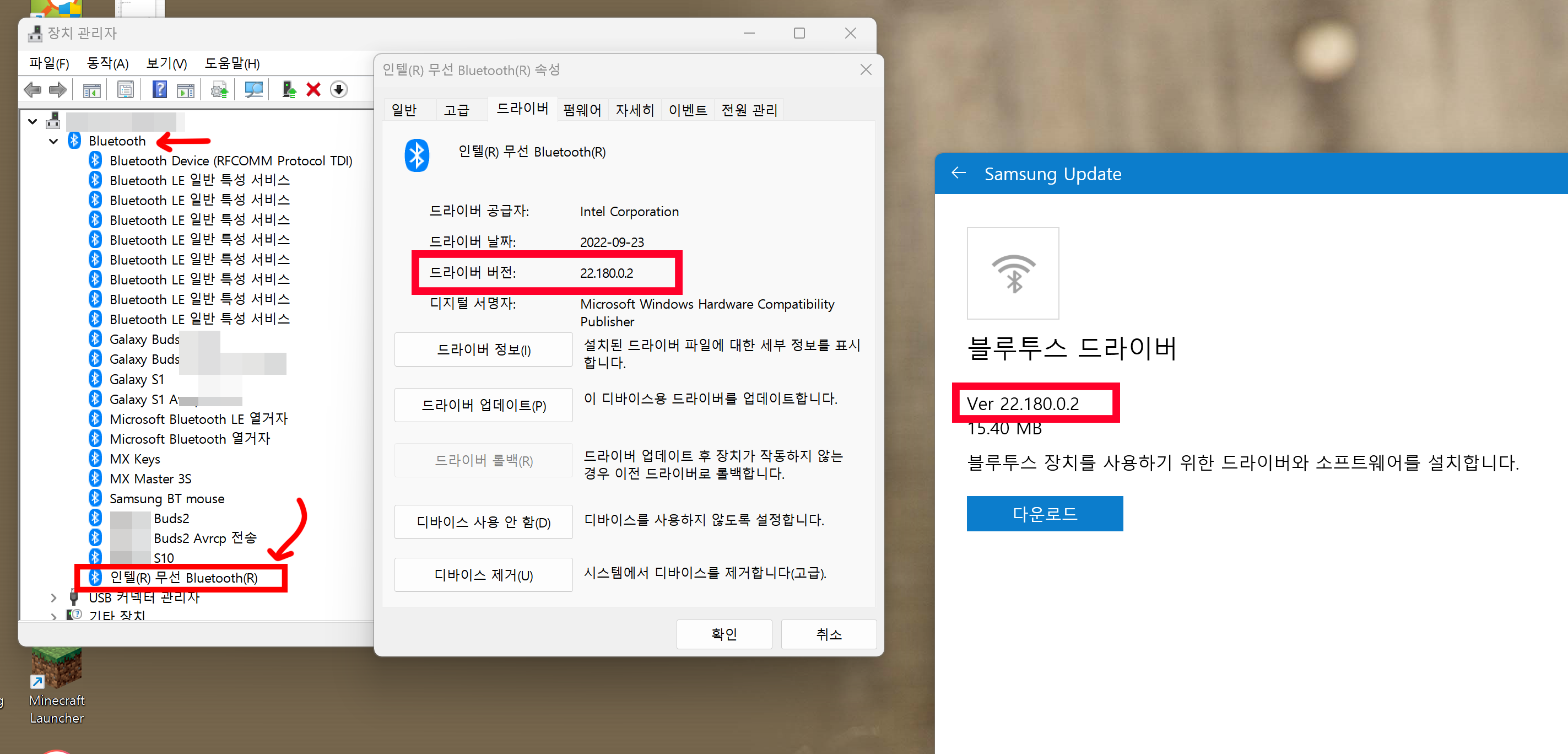 그리고 아래 이미지와 같이 노트북 제조사 프로그램에 올라와있는 버전과 현재 PC에 설치되어 있는 블루투스 드라이버 버전을 봅니다. 저 같은 경우는 버전이 다른 것이 설치되어 있어서 이미 수정한 상태입니다.