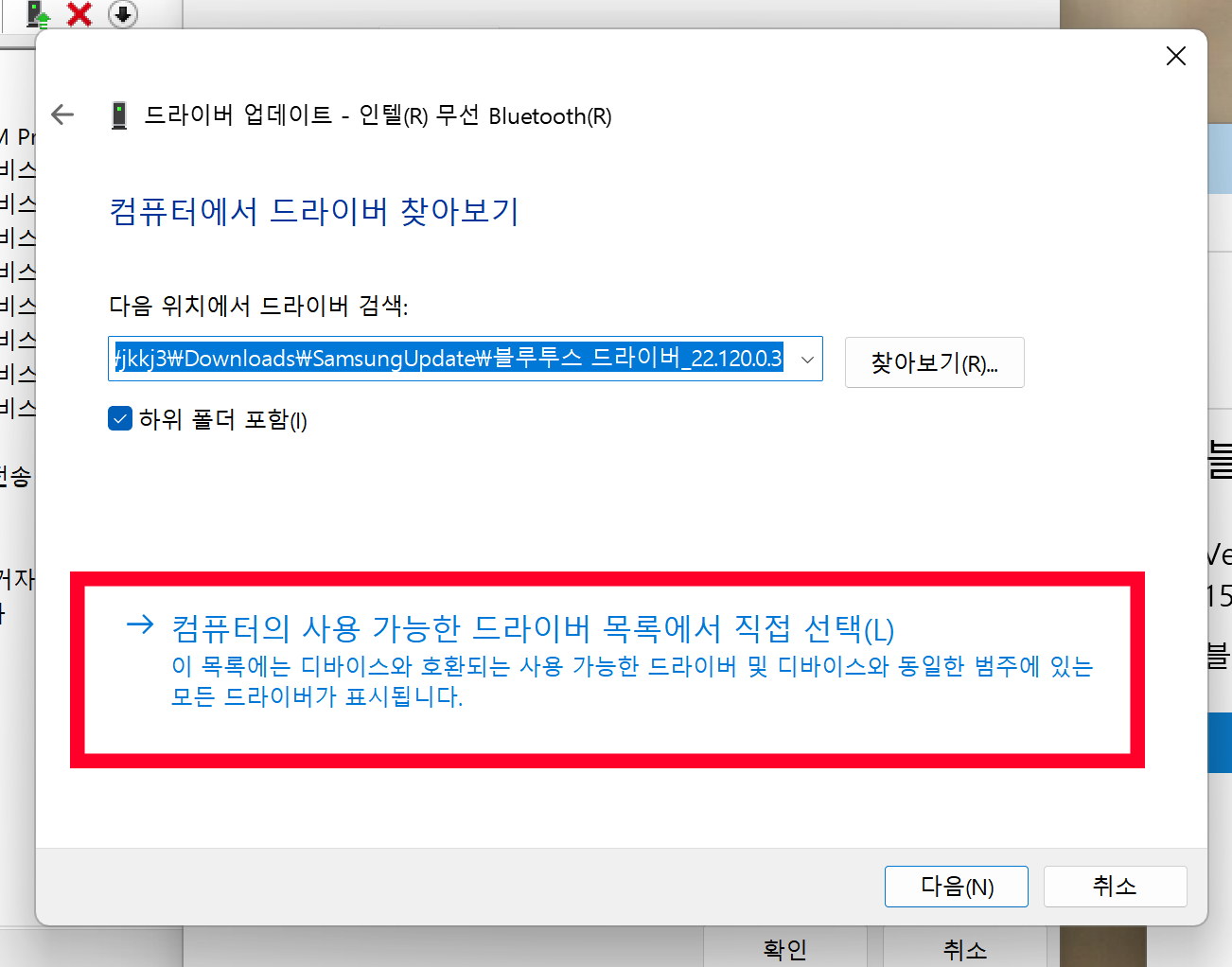 컴퓨터의 사용 가능한 드라이버 목록에서 직접 선택 클릭.