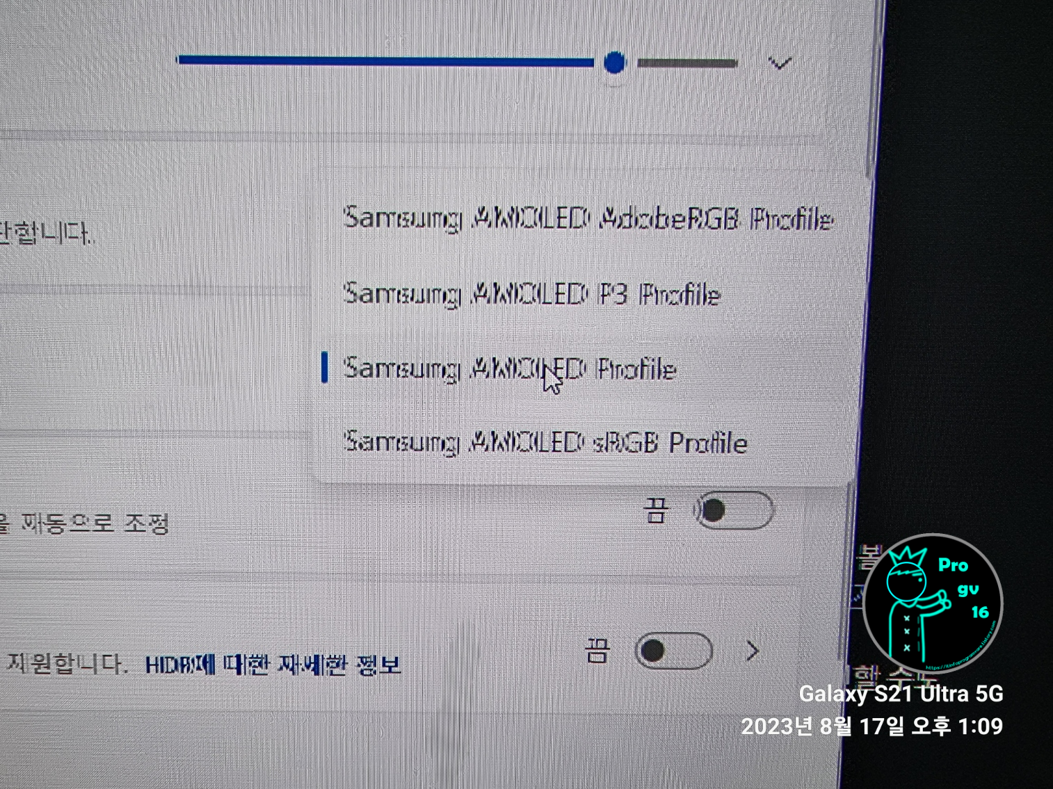 디스플레이 설정에 HDR 옵션을 사용할 수 있어서 켜면 이렇게 됩니다. 갤럭시북 프로 i5 제품입니다.