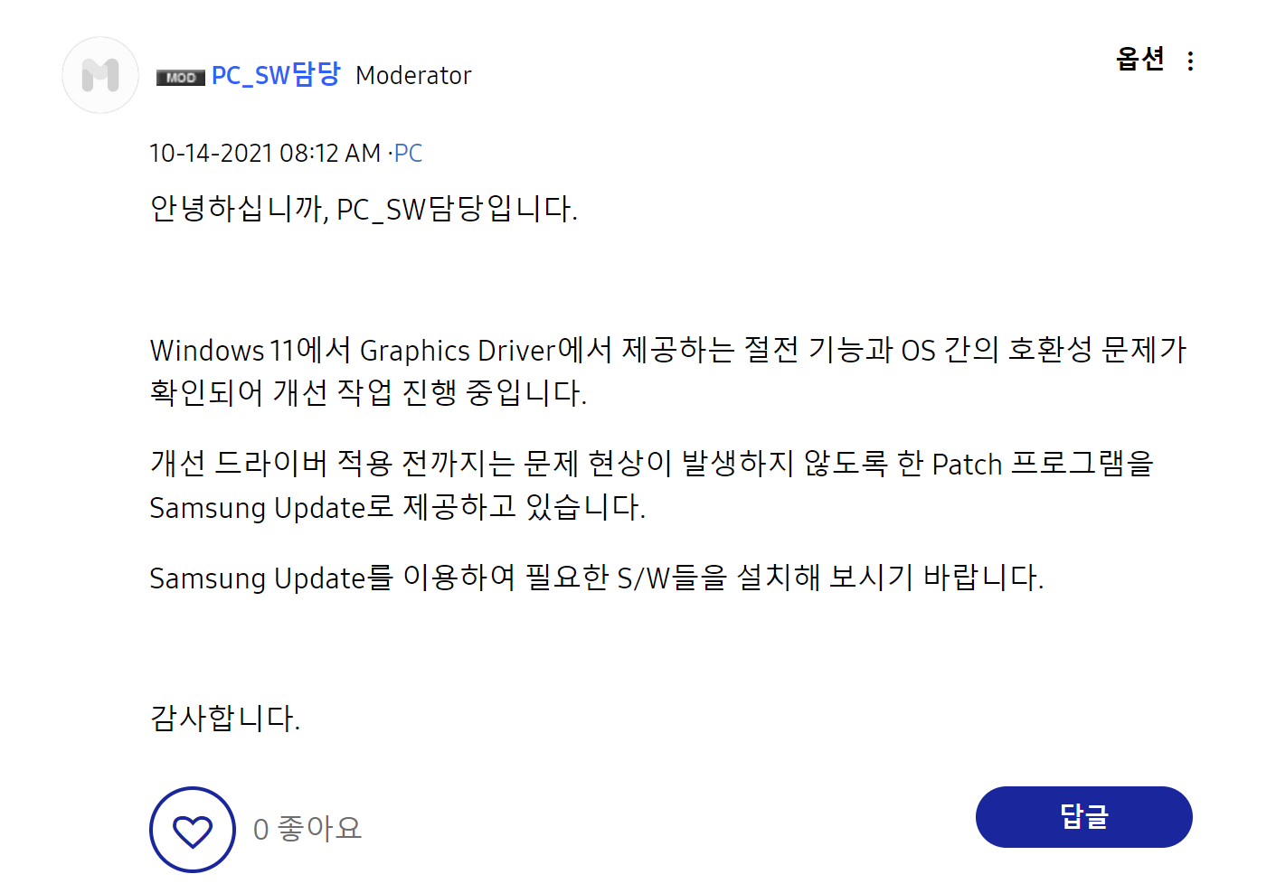 저 같은 경우에는 삼성 업데이트에서 이미 모든 것을 최신 드라이버로 받은 상태이며 펌웨어 업데이트도 전부 완료한 상태입니다. 그래도 지금까지도 해결되지 않고 동일하며 더 아래에 있는 댓글을 보니 (댓글 상으로는) 서비스센터에서 윈도우10으로 다운그레이드 하라는 답변을 주었다는 것 같네요.