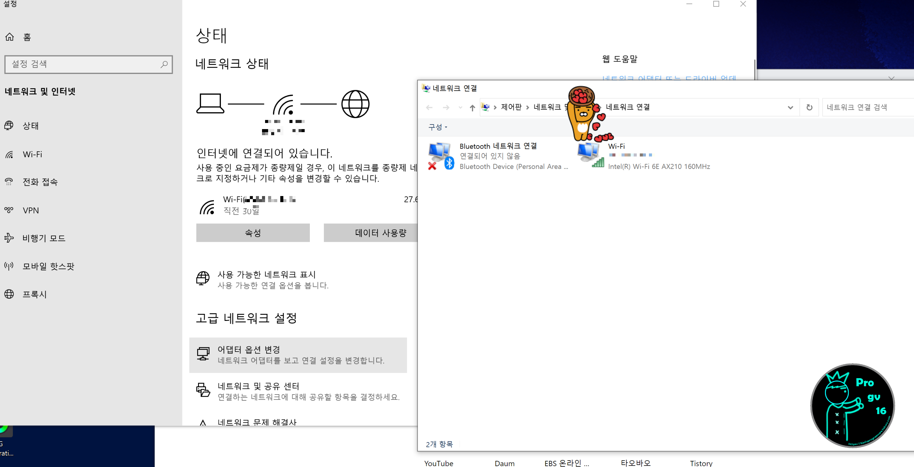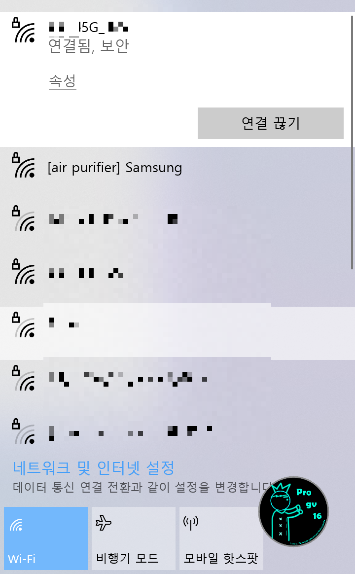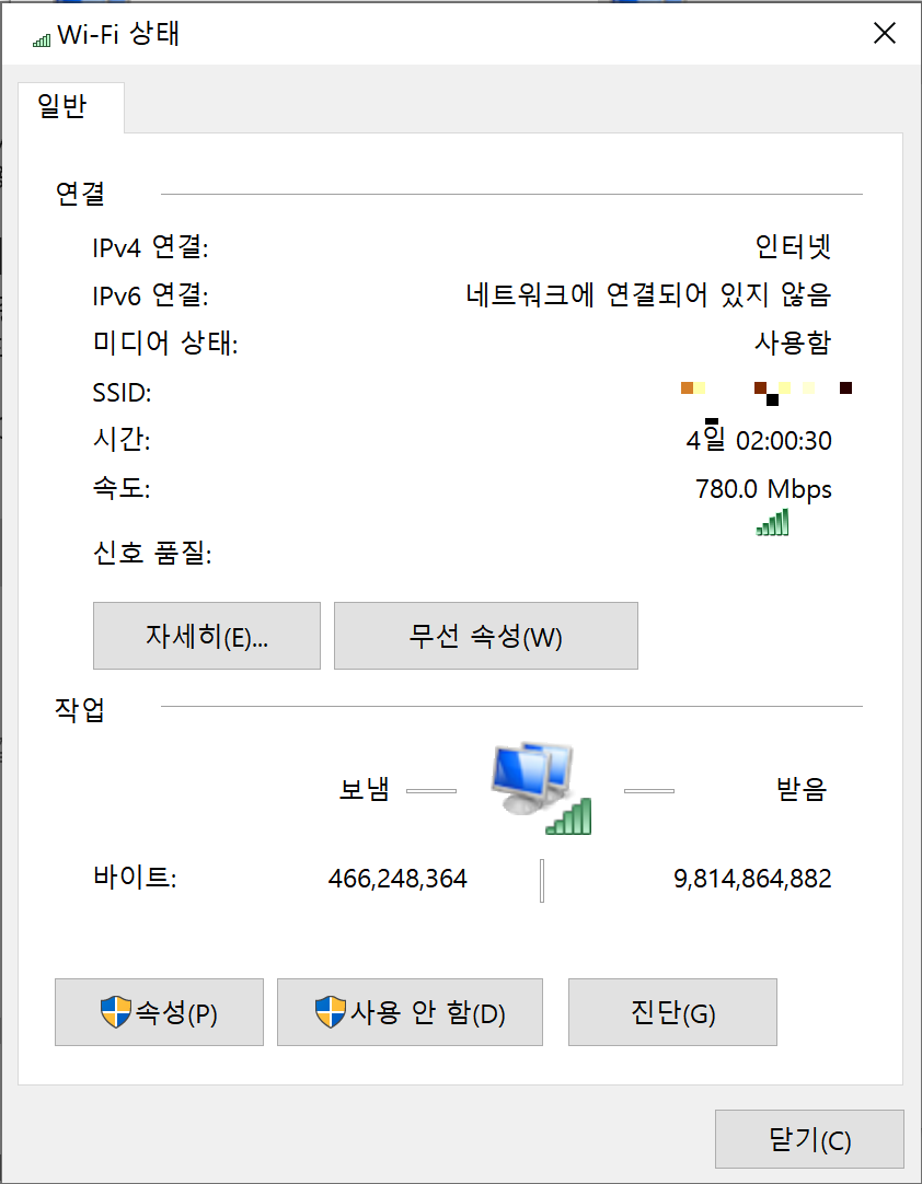 작업표시줄의 와이파이 로고 우클릭 -> 네트워크 및 인터넷 설정 열기 -> 어댑터 옵션 변경 (네트워크 연결 창이 뜹니다) -> Wi-Fi 더블클릭(라이언 이모지 있는 곳)