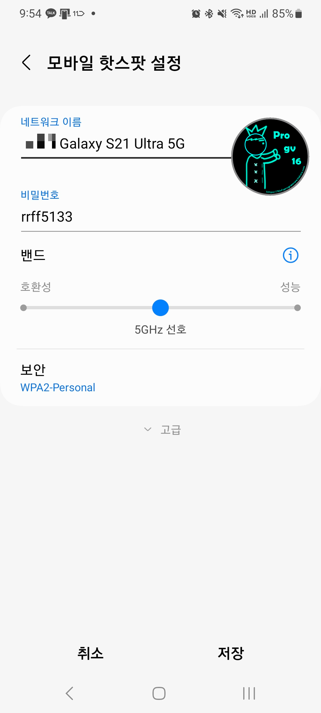 안드로이드(삼성 갤럭시)의 경우에는 주파수 대역 5GHz 설정 후 고급버튼을 눌러서 절전모드를 해제해주세요.