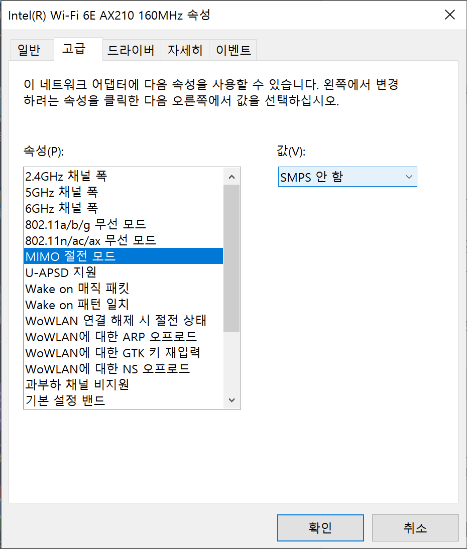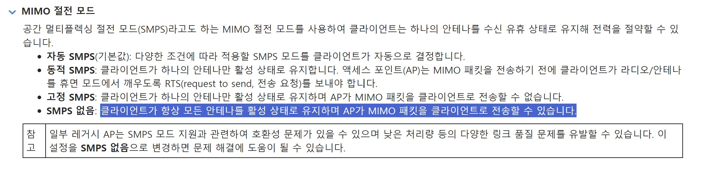 MINO 절전모드의 SMPS 없음으로 설정할 시 모든 안테나를 FULL로 활성화시켜서 속도 향상에 도움을 줍니다.
