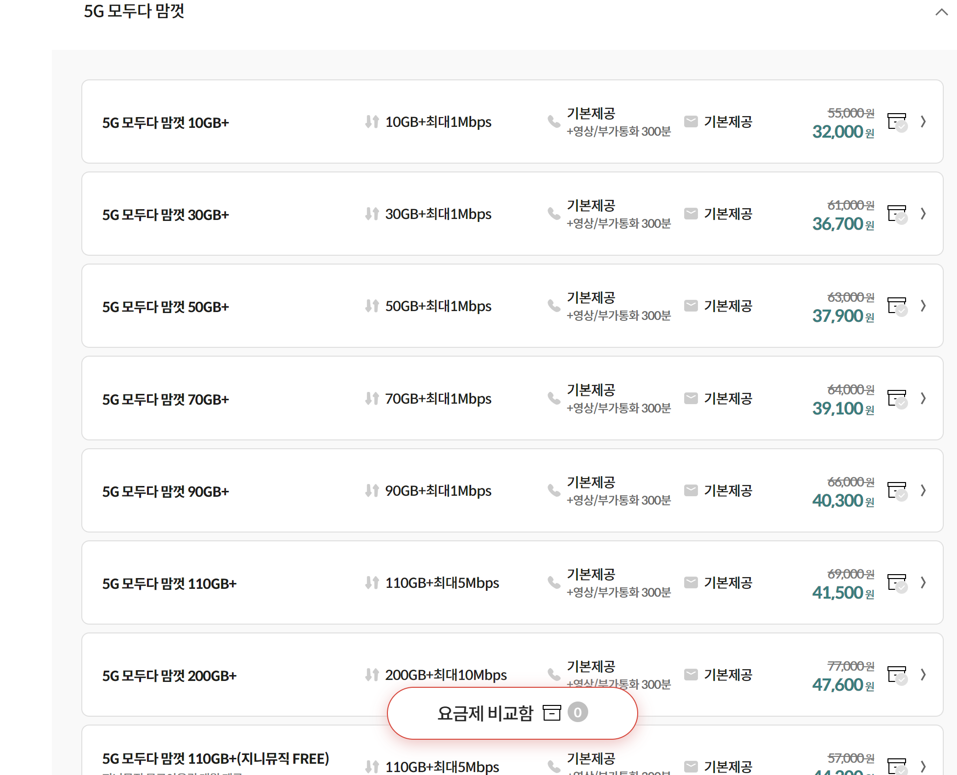 5G 모두다 맘껏 110GB+ / 월 41,500원 / KT망