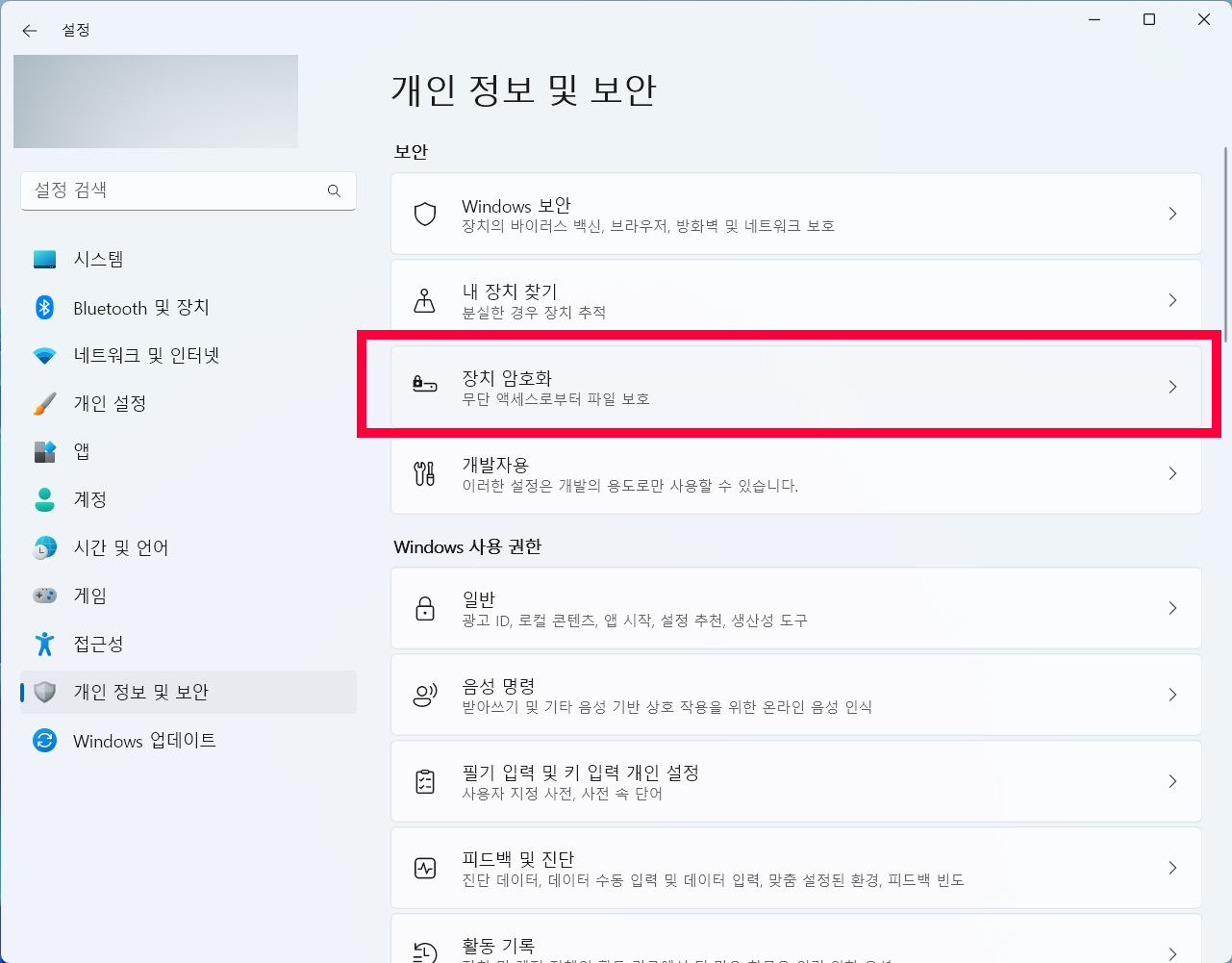 개인정보 및 보안 탭을 클릭하시면 장치 암호화라는 항목이 보입니다.
