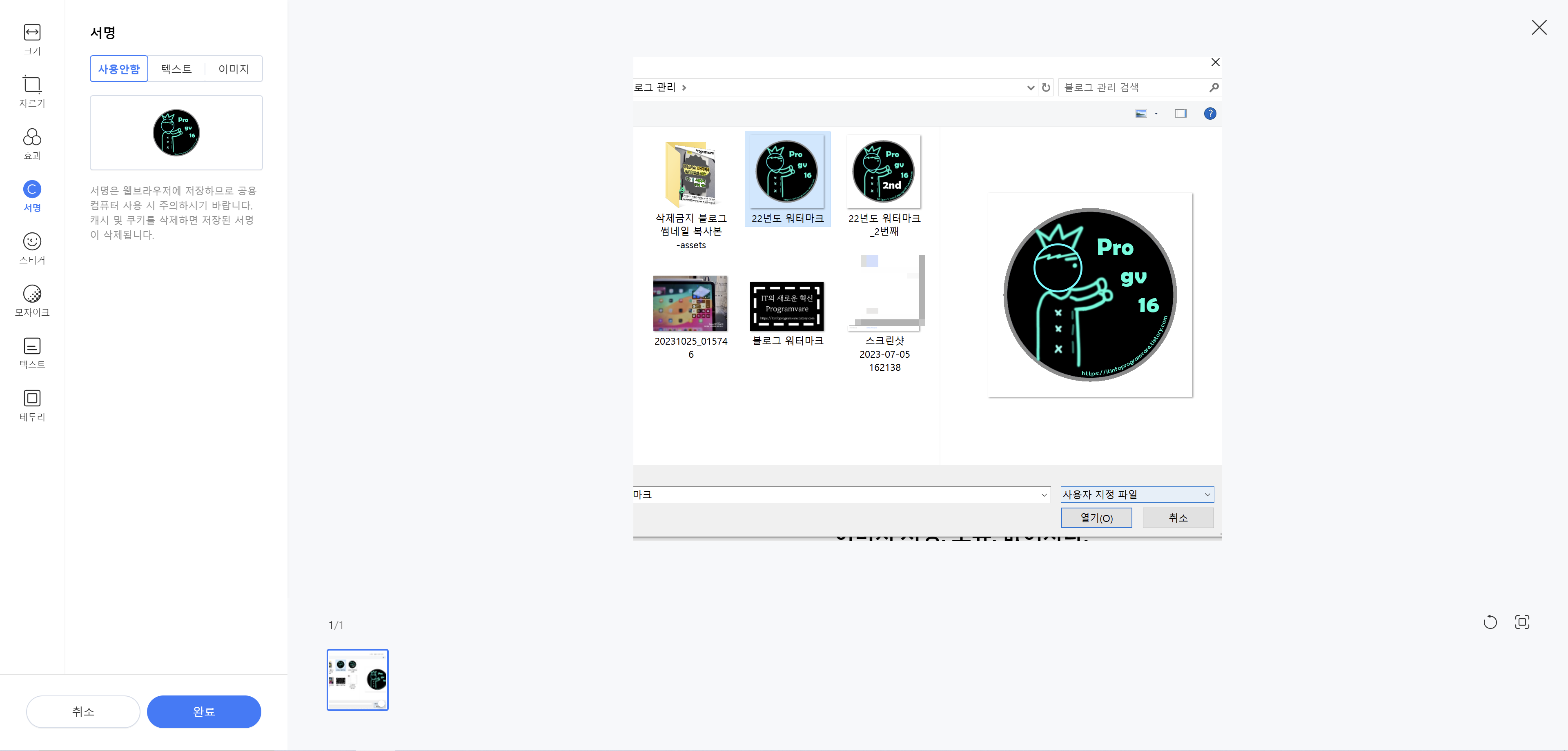 이미지 편집 -> 서명 -> 이미지 -> 추가