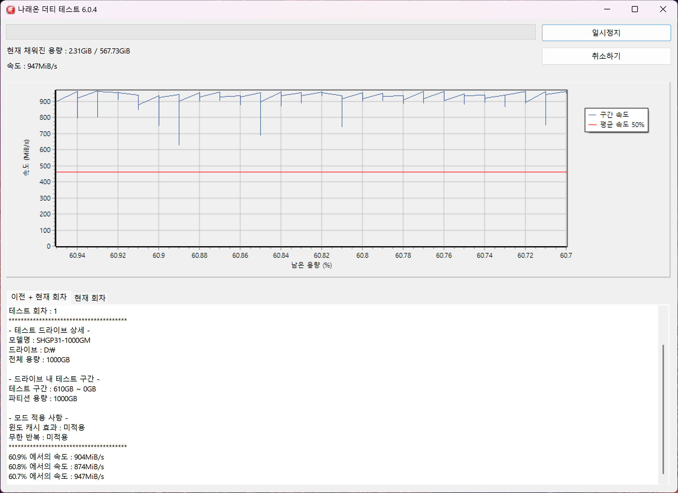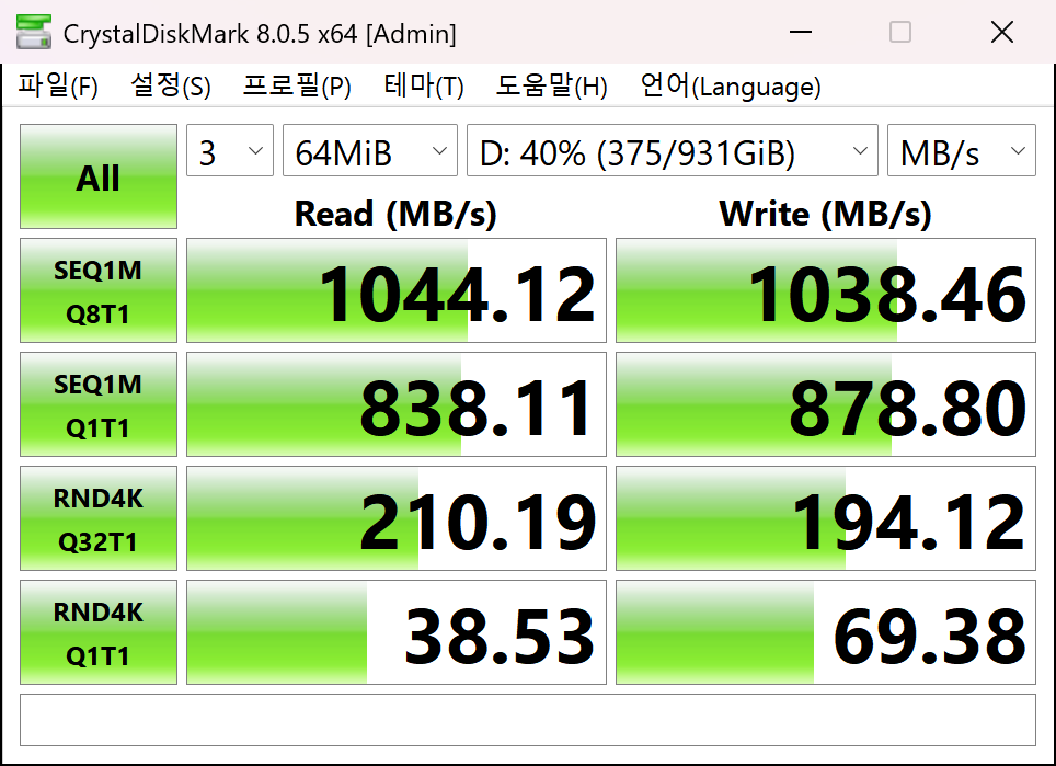 나래온 더티 테스트는 스크린샷이 중간에 캡처되지 않아서 아래 이미지 밖에 없지만 지난번 사용했던 디램리스 SSD와는 다르게 중간지점(캐시 영역?) 그 이상까지 안정적으로 700 - 900Mib/s의 속도를 유지해 주었습니다. 외장으로는 거의 디램리스만 사용해와서 이 점은 꽤 놀랐습니다.