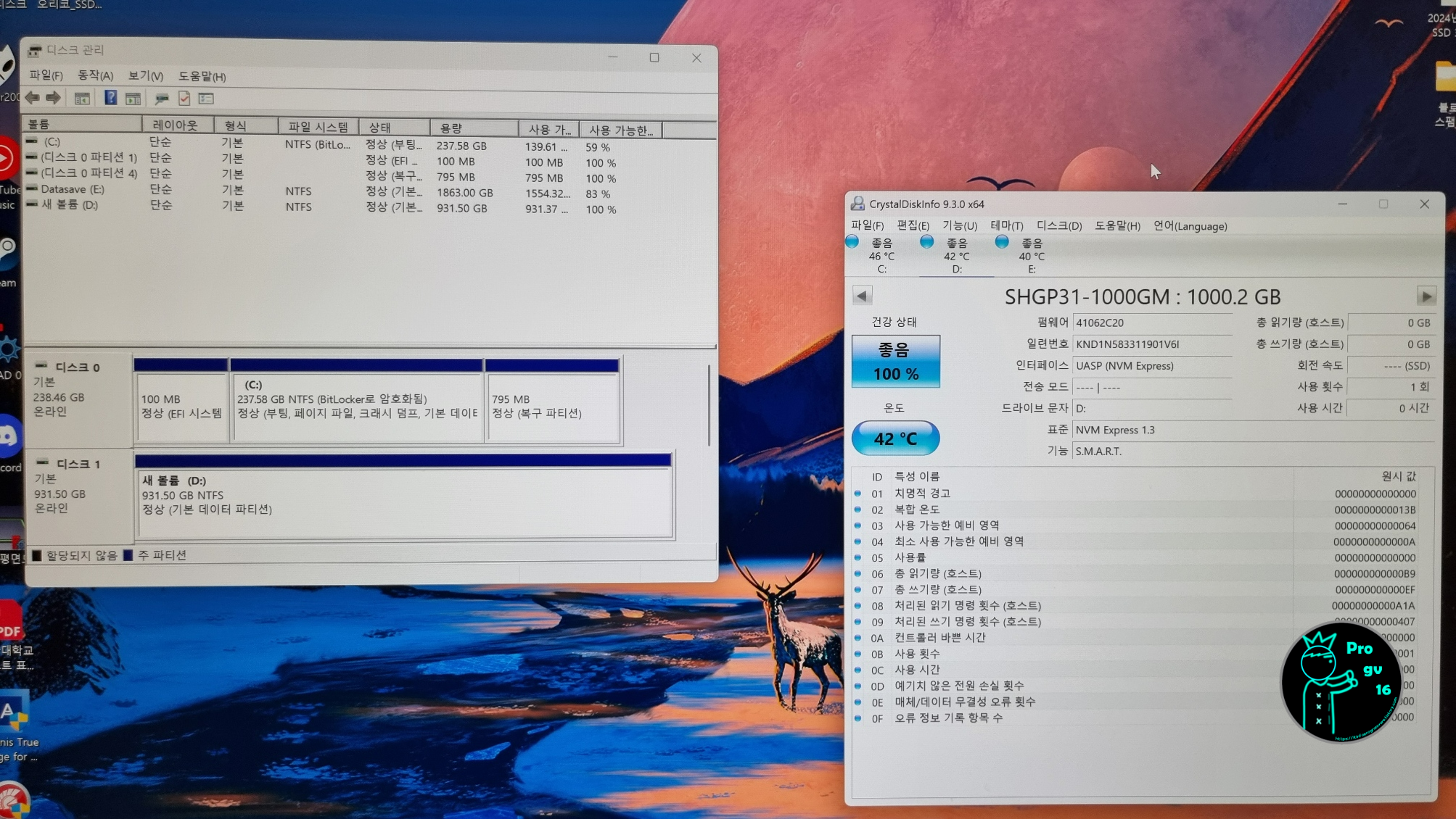 디스크 관리에서 디스크 할당 해주고 Crystaldiskinfo 프로그램 들어가서 현재 사용 중인 SSD의 SMART정보를 볼 수 있습니다. Read/Write 모두 0GB 인 것으로 보아 새 제품이 온 것이 맞네요. 사실 해외직구품이라 살짝 불안하기는 했다만 1차적 안심을 하며.