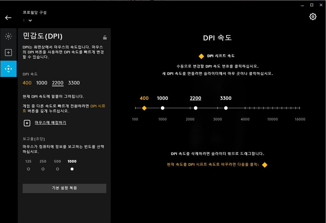 DPI설정입니다. 앞서 말했다시피 Hero 16K 센서라서 100 DPI부터 16000 DPI까지 원활히 조정이 가능합니다.