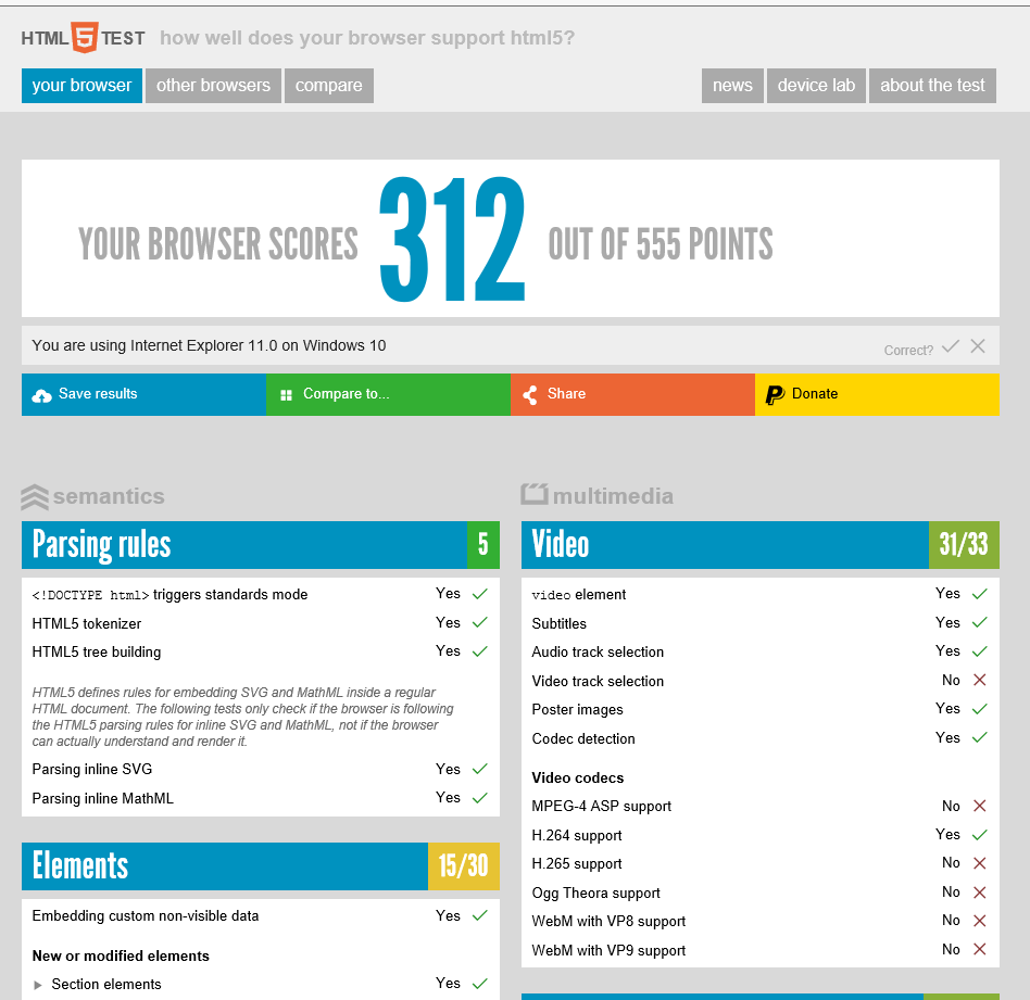 html5test.com 사이트에 따르면 IE11의 점수는 312/555이 나왔습니다. 크롬은 476점, 파이어폭스는 466점이 나옵니다.