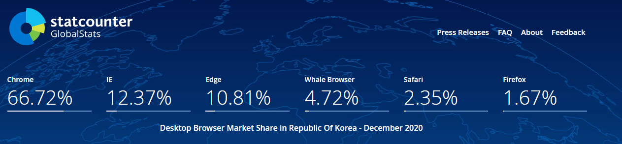 대한민국은 1위 크롬(66%), 2위 인터넷 익스플로러 (12%)로 타 국가 평균 점유율에 비해서는