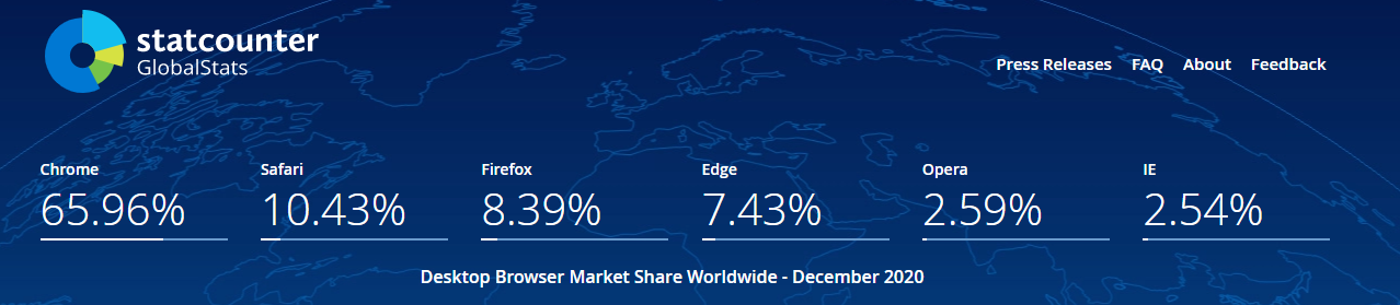 크롬의 점유율이 1위(65%)이며, (중략) 5위 IE 인터넷 익스플로러 (2.54%) 입니다.