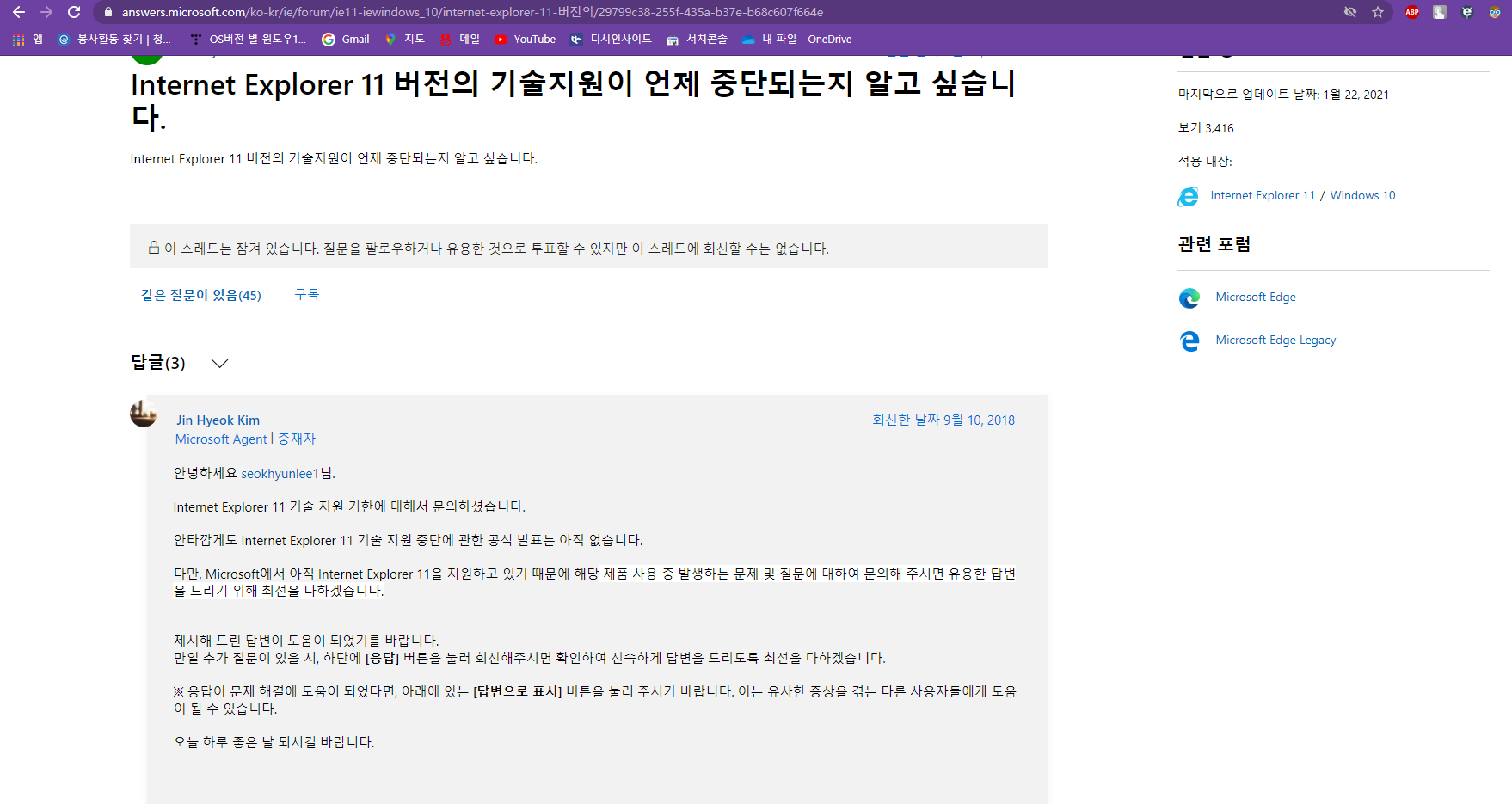 윈도우10의 인터넷 익스플로러11의 공식 지원종료일자는 아직 알려진 바 없습니다.