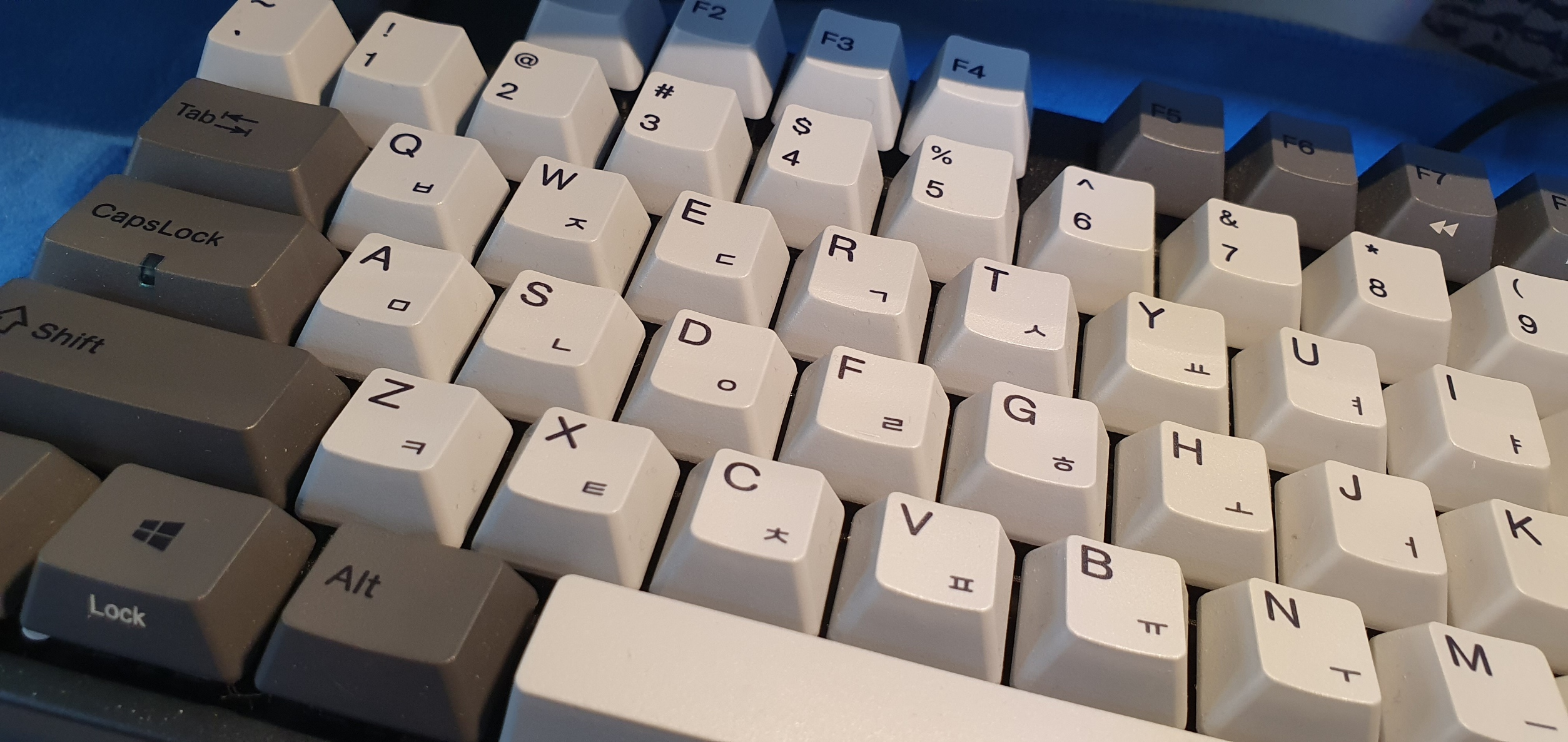 이 키보드의 PBT 키캡은 고운 것 같으면서도 약간 까끌까끌한 느낌이며, 계속 사용한다고 끈적임 같은 타건의 이질감이 들지 않았습니다.