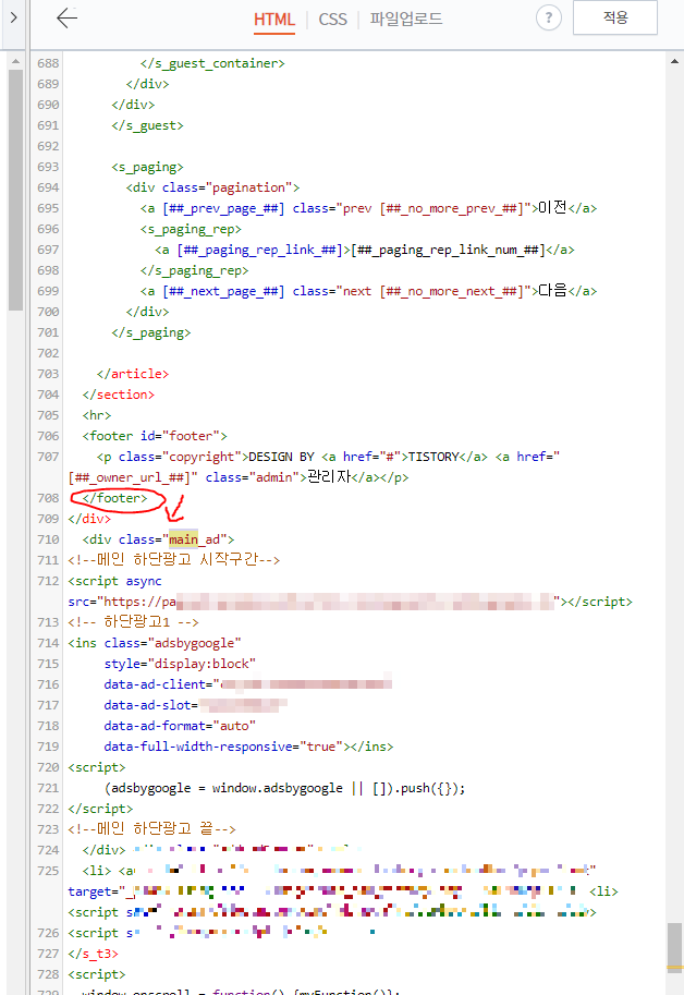 저는 하단광고 아래에 하단스킨 이미지를 넣을 것이므로 <!--메인 하단광고 끝-->(이런 기호로 구분 해놓지 않았다면 위의 이미지 보고 끝부분 </script> 찾아보시기 바랍니다) 바로 아래에 푸터영역(하단스킨) 이미지 Html코드를 삽입 할 겁니다.