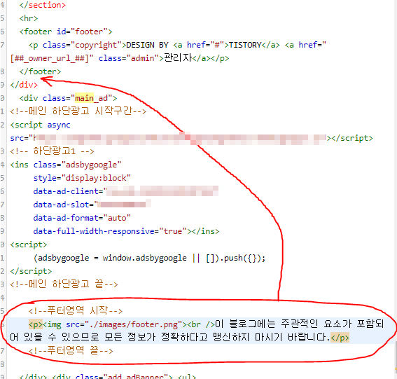 혹시 하단 구글 애드센스 광고 위에 하단스킨을 넣고 싶으신 분들은 아래 이미지처럼 </footer> 바로 아래쪽에 위의 코드를 삽입하면 됩니다.