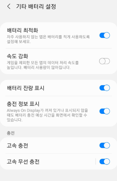 설정>배터리 및 디바이스 케어>배터리>기타 배터리 설정>고속충전 (삼성 안드로이드 11 OS 기준)