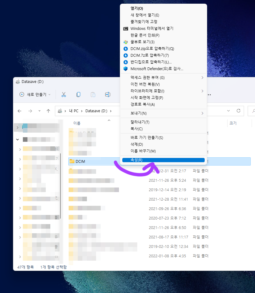 먼저 파일 로딩이 느린 폴더를 1번 클릭한 후 오른쪽마우스 버튼을 눌러서 속성(R)을 클릭합니다