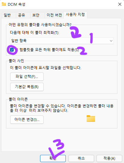 첫번째로 다음에 대한 이 폴더 최적화를 "일반 항목" 으로 변경