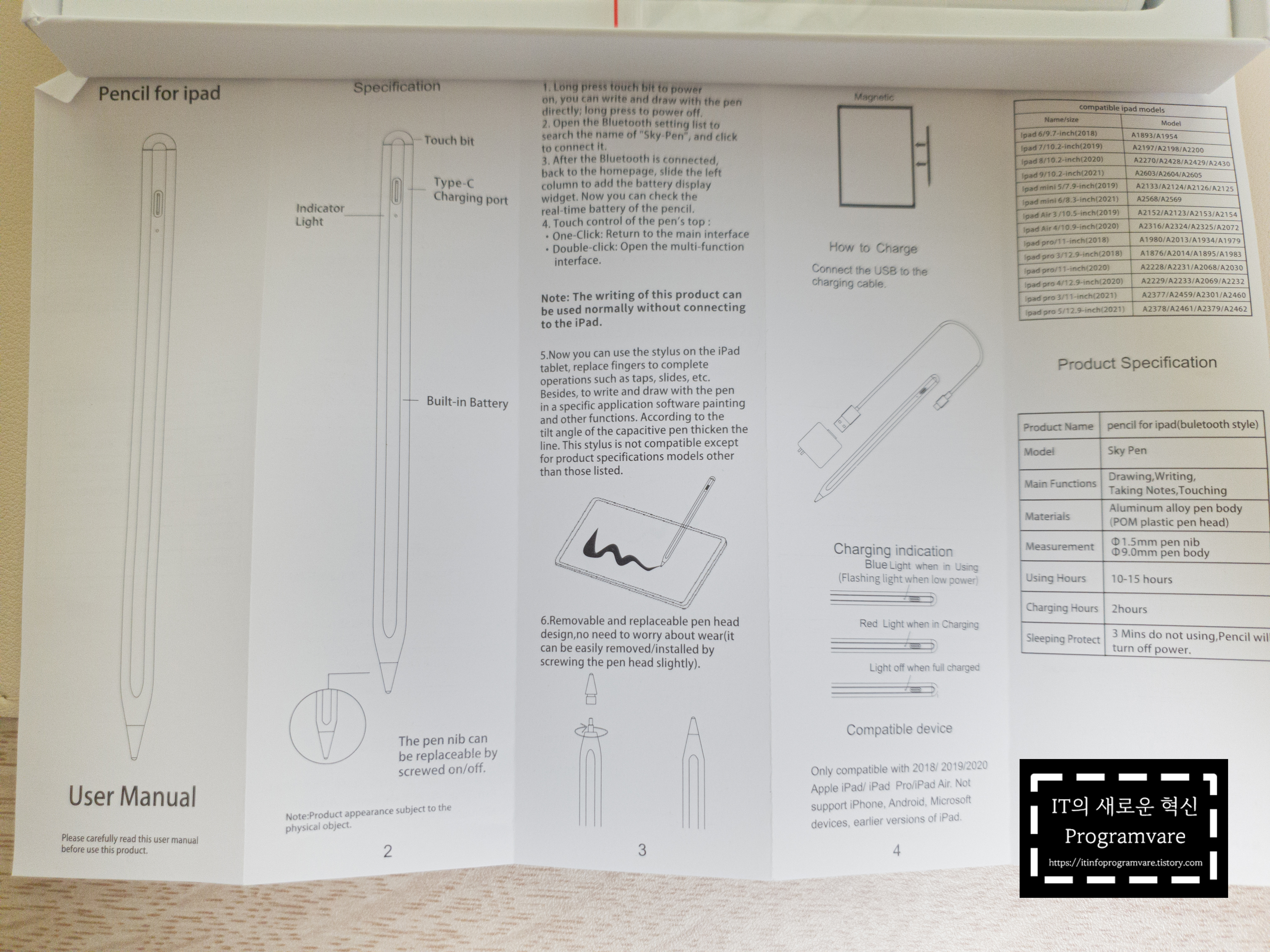 위 까지는 개봉기였습니다. 사용방법은 다른 블로그에 많고 제품 설명 페이지에 있으니 참조해서 사용바랍니다. 혹시 몰라 동봉되어 있는 설명서도 같이 올려드립니다. (아이패드 에어 5세대 - 2022) 호환됩니다.