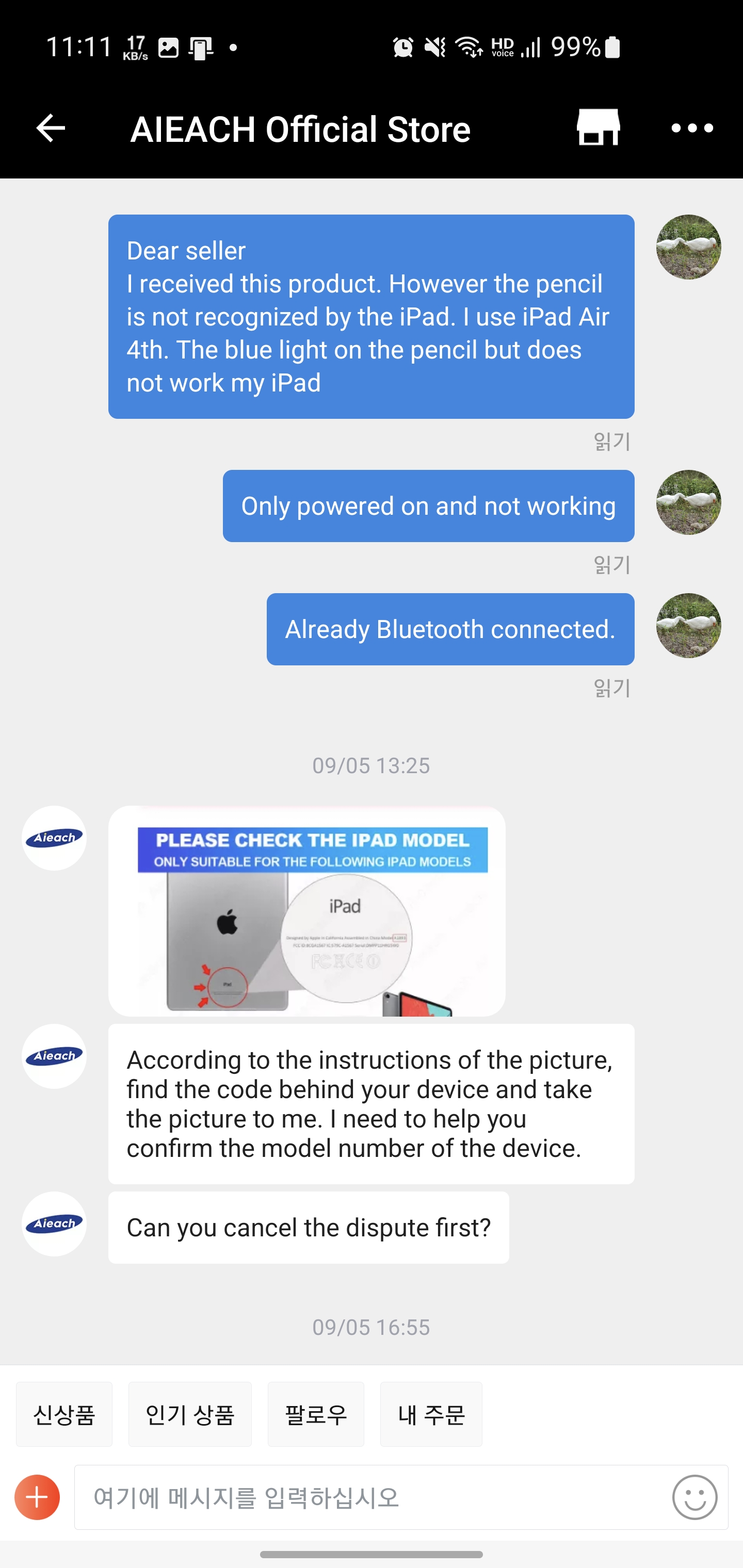 앞에 첨부한 사진들을 바탕으로 펜슬 상태를 쉽게 알 수 있게끔 영상까지 촬영하여 증거 업로드 후 디스풋 진행하였습니다. 판매자가 다른 말 못하게.