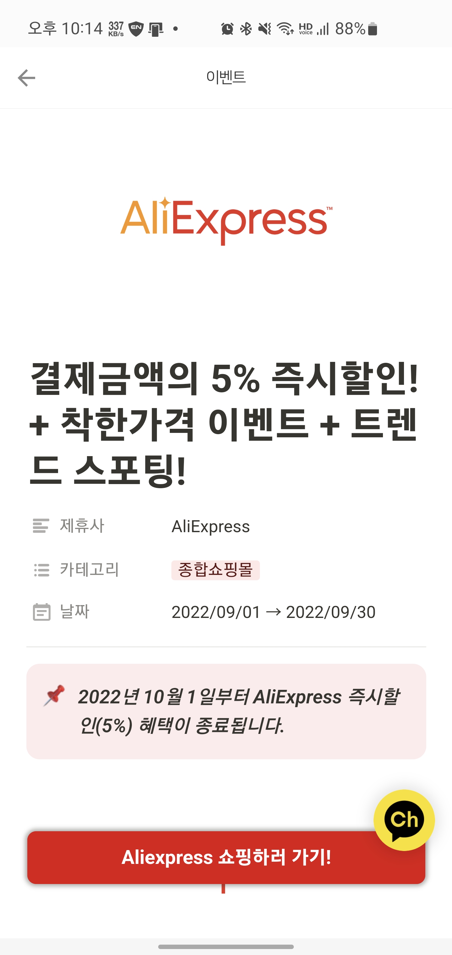 하지만 지난 달에는 아마존 혜택을 없앰과 동시에 2022년 10월 부터는 알리익스프레스 5%의 할인도 없어지게 됩니다. 자세한 원인은 관계자가 아니라서 저도 잘 모르겠지만 비자카드 환율 수수료 적용이 없는 무료라는 점만 제외하면 이전에 비해서는 메리트가 크지는 않다고 개인적으로 생각이 듭니다.
