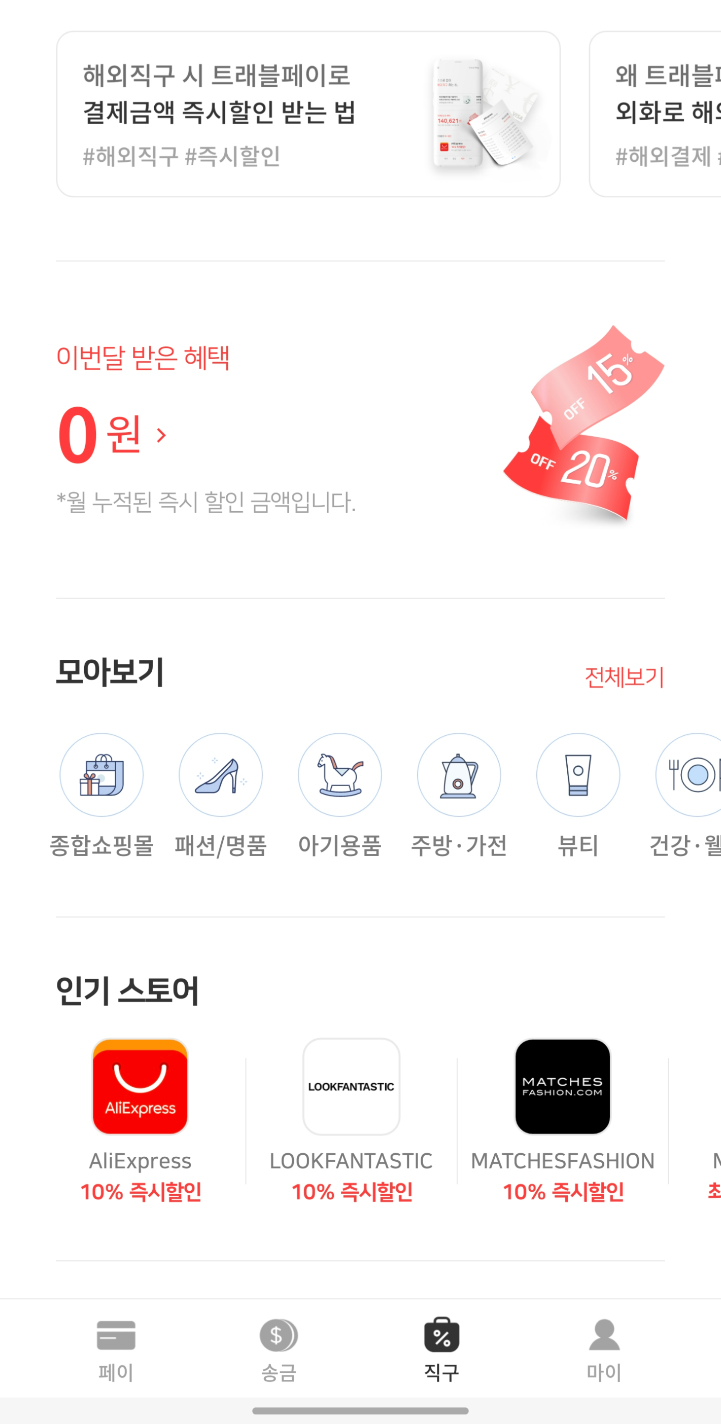자세한 사항은 트래블월렛 앱 <직구 탭 <전체보기를 이용하여 확인이 가능하오나 간단한 사항을 설명하자면 트래블페이 카드를 사용 시 알리익스프레스나 아마존, 아이허브 등의 유명하고 잘 알려진 해외직구 사이트들에는 결제 시 즉시 자동으로 10% 할인이 적용됩니다.