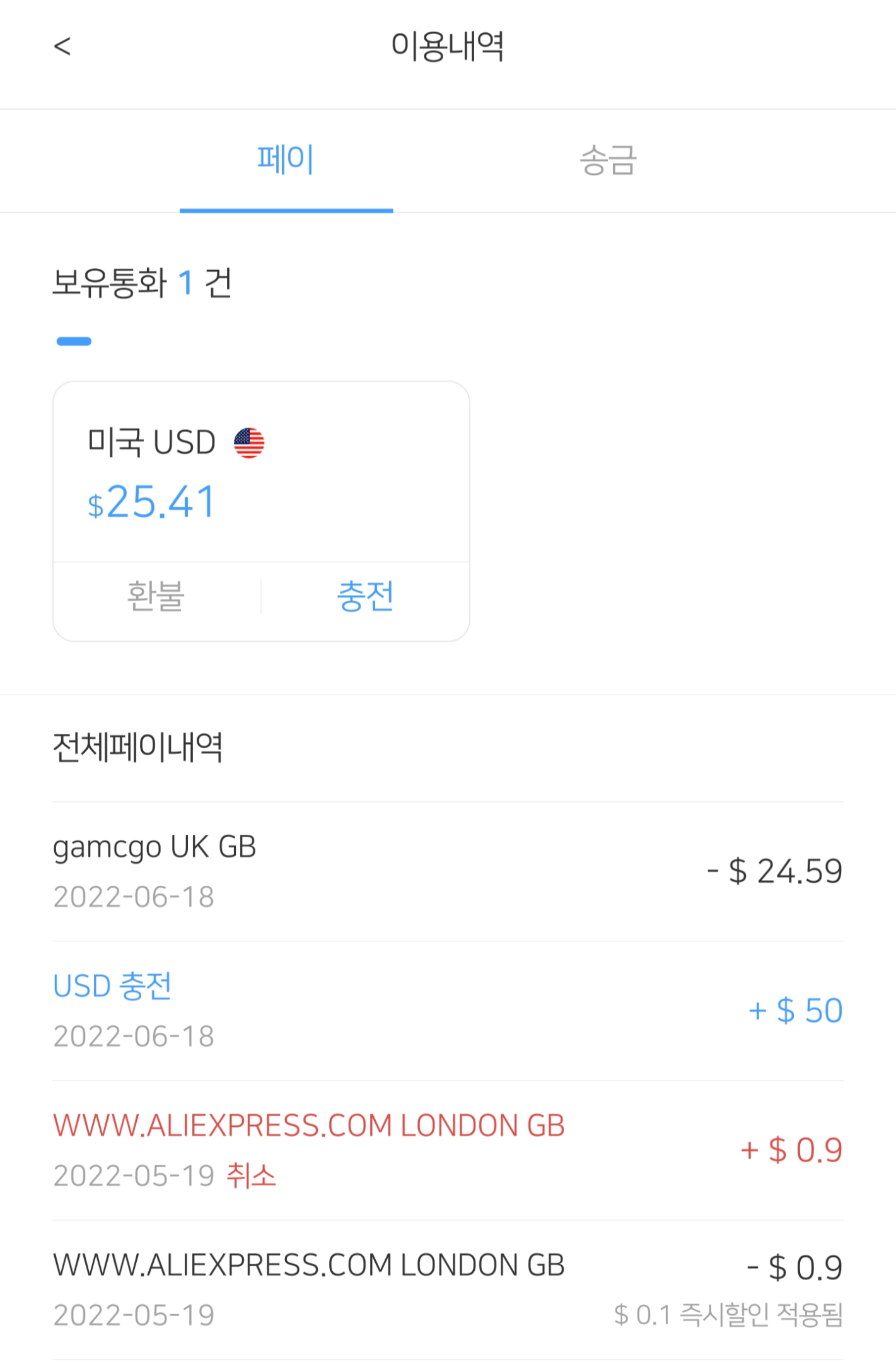 저도 처음에는 소액을 입금해 놓아서 조그마한 것들 알리익스프레스에서 구매할 때 써먹어야겠다는 생각으로 자주 이용하려고 하였습니다. 하지만 윗부분의 빨간 문구. 아무리 돈을 모았다고 해도 위의 "최소 50달러 이상 충전 가능"이라는 문구가 편하게 이용이라는 목적에 걸맞지 않는 금전적인 부분으로 인해 걸림의 요소가 된 것이 아닐까 싶습니다.