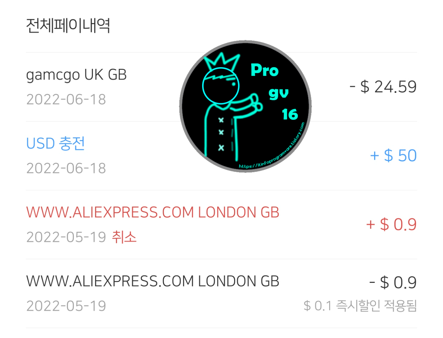 아래에는 알리익스프레스 카드등록 시 카드확인을 위해서 원래는 $1.00usd 이 출금되어야 하지만 자동으로 할인된 금액인 $0.9usd가 출금된 내역입니다. 출금 홈페이지 명이 제휴사이트로 등록된 경우에는 자동으로 즉시할인이 되는 것 같습니다.