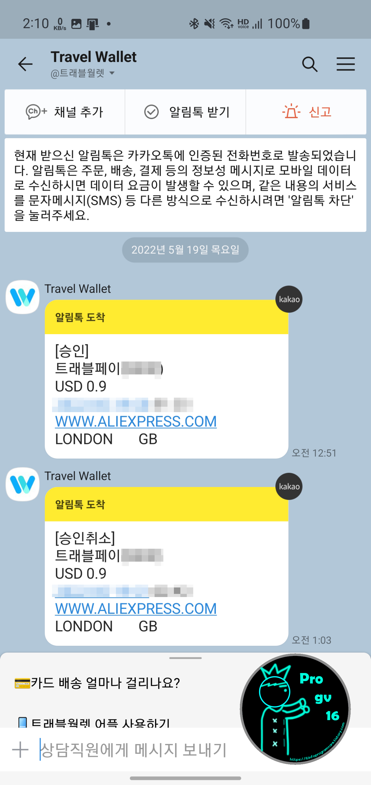 국내에서 사용량이 많지 않은 외화선불카드에서 이 정도 금액을 월 결제 하면서 문자로 받아야 한다면 조금 부담스러울 수 있겠지만 트래블페이 같은 경우는 출금내역을 무료로 카카오톡 또는 문자메시지SMS를 통해 발송해 줍니다.