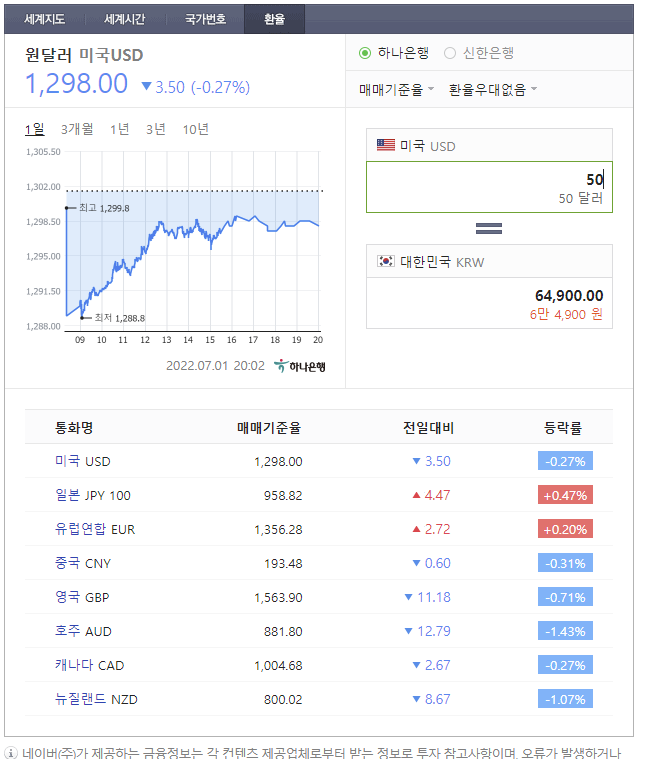 하지만 트래블페이의 환율 적용 기준은 하나은행의 실시간 매매기준율을 기준으로 하여 네이버 환율 검색시의 금액과 동일하게 환전이 가능합니다. 또한 계산기 필요없이 한번의 검색으로 적용 환율을 그대로 알 수 있다는 장점도 있다고 말할 수 있겠습니다.