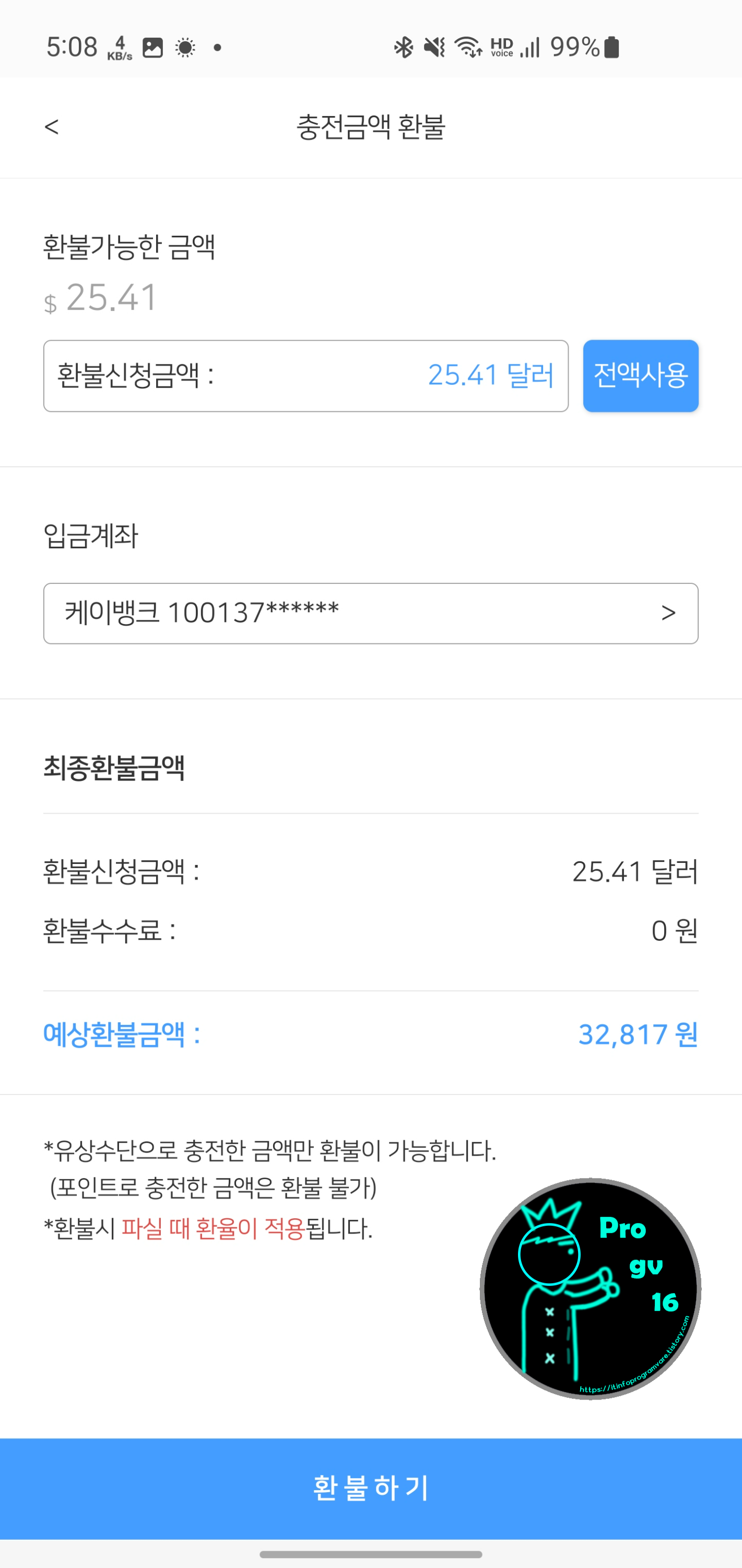 다만 팔 때 환율이 적용되기 때문에 먼저 외화를 충전한 금액에 비해 환차익들을 고려하여 더 적은 원화가 입금됩니다. 이 점은 유의하셔서 환불을 결정하시기 바랍니다.