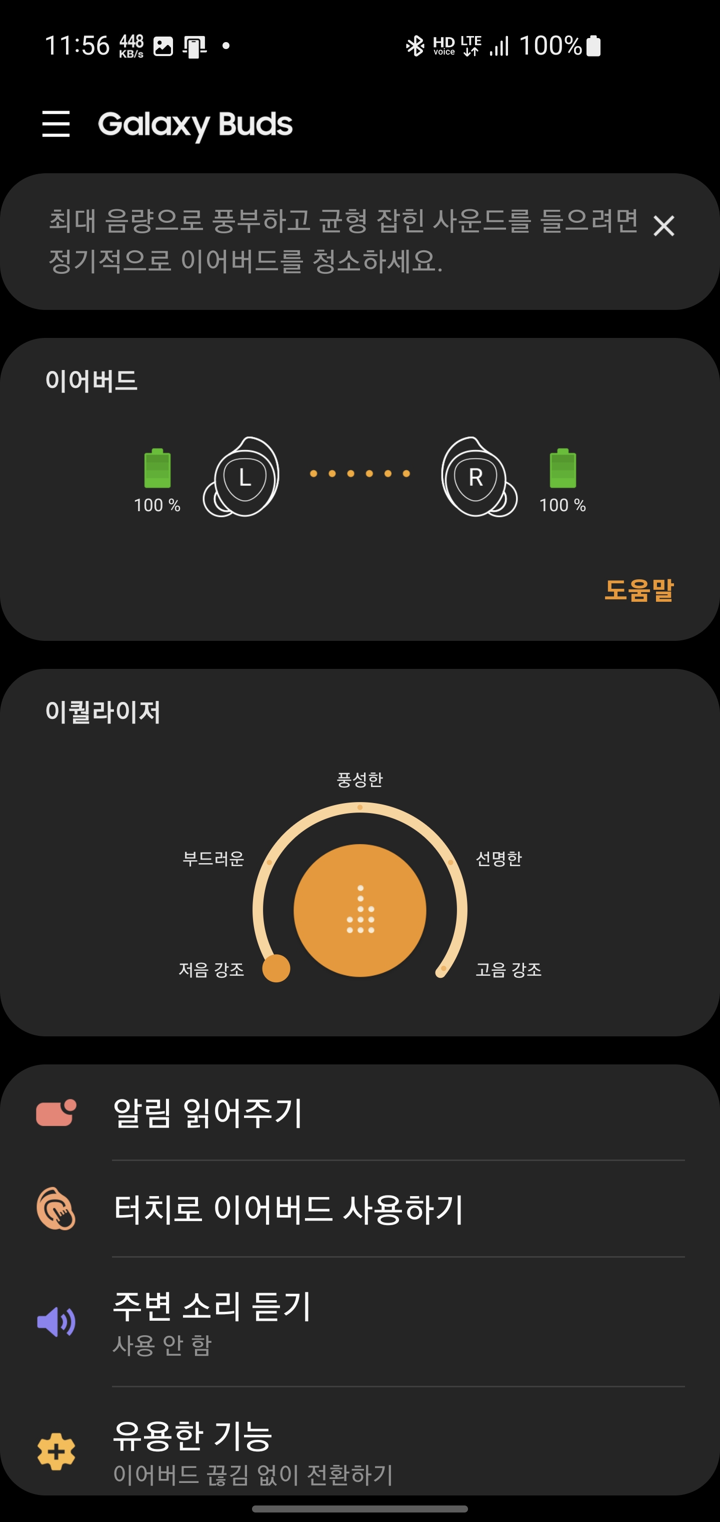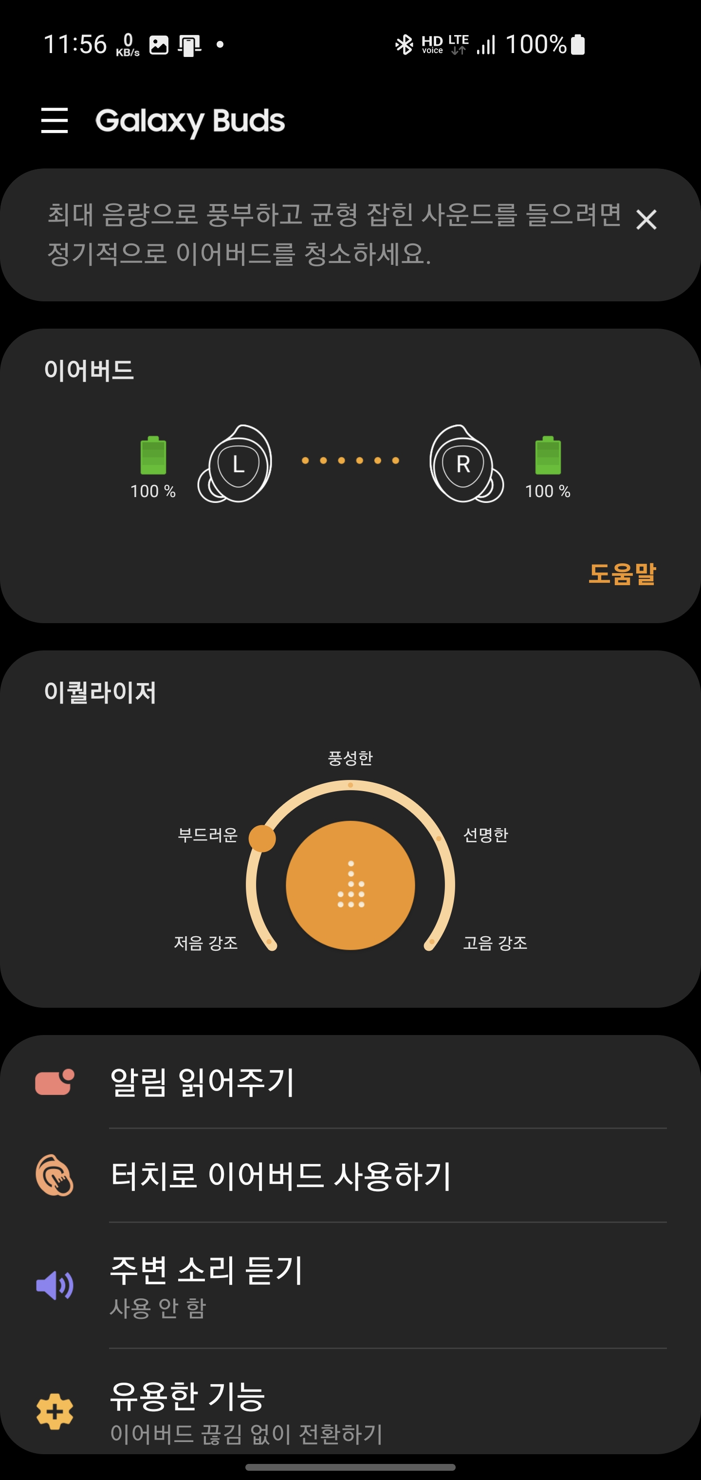 갤럭시 버즈의 기본적인 이퀄라이저 설정 "풍성한" 노브가 딱 가운데에 있고 별다른 기능이나 사운드를 원하지 않는 분들은 거의 건드리지 않고 이대로 사용해오고는 있습니다. 저음강조 모드로 한 것처럼 딱히 이질감이 느껴지는 부분이 아니기도 하고 말이죠.