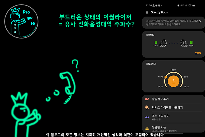 이어폰 자체는 잘 만들어진 것으로 보입니다. 하지만 이어버드 소프트웨어 업데이트나 Galaxy Wearable 어플의 개선을 통하여 이퀄라이저 부분을 좀 더 개선하면 좋을것으로 보입니다. 아니면 다음세대는 이미 개선되었을까요.