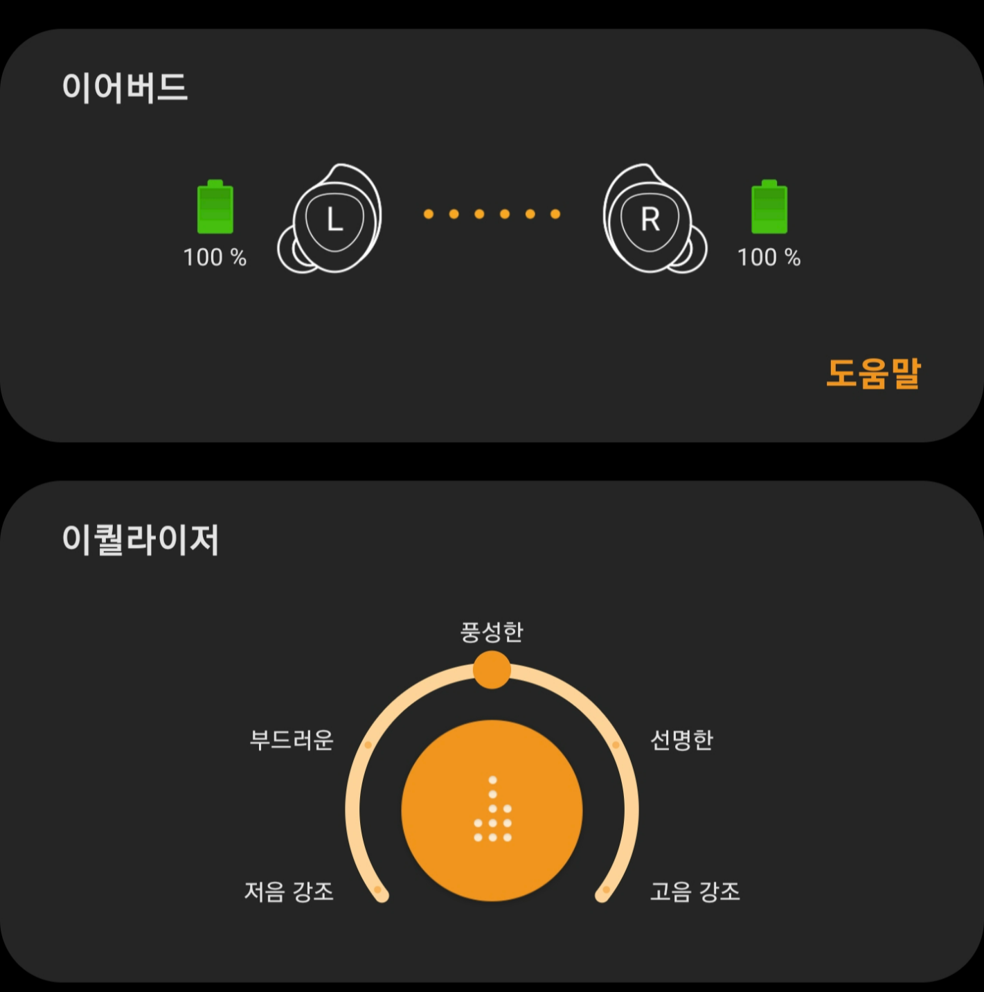 일단 갤럭시 버즈 1세대를 연결하고 나서 기본적으로 이퀄라이저 기능을 켜고 나면 노브가 가운데인 "풍선한"으로 설정되어 있습니다. 여기까지는 음질이 들어줄만 하다, 괜찮지 않냐 라고 느낄 수 있습니다.