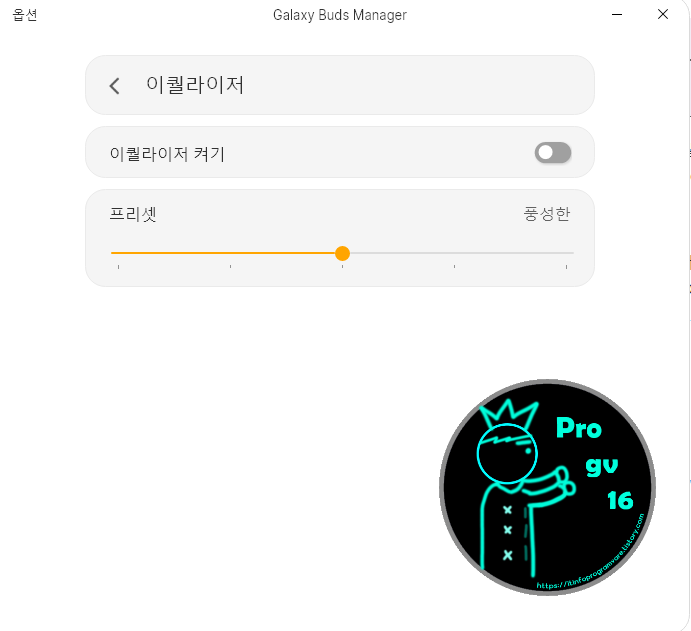 일단 갤럭시 버즈 1세대를 연결하고 나서 기본적으로 이퀄라이저 기능을 켜고 나면 노브가 가운데인 "풍선한"으로 설정되어 있습니다. 여기까지는 음질이 들어줄만 하다, 괜찮지 않냐 라고 느낄 수 있습니다.