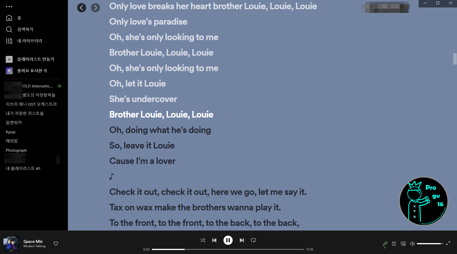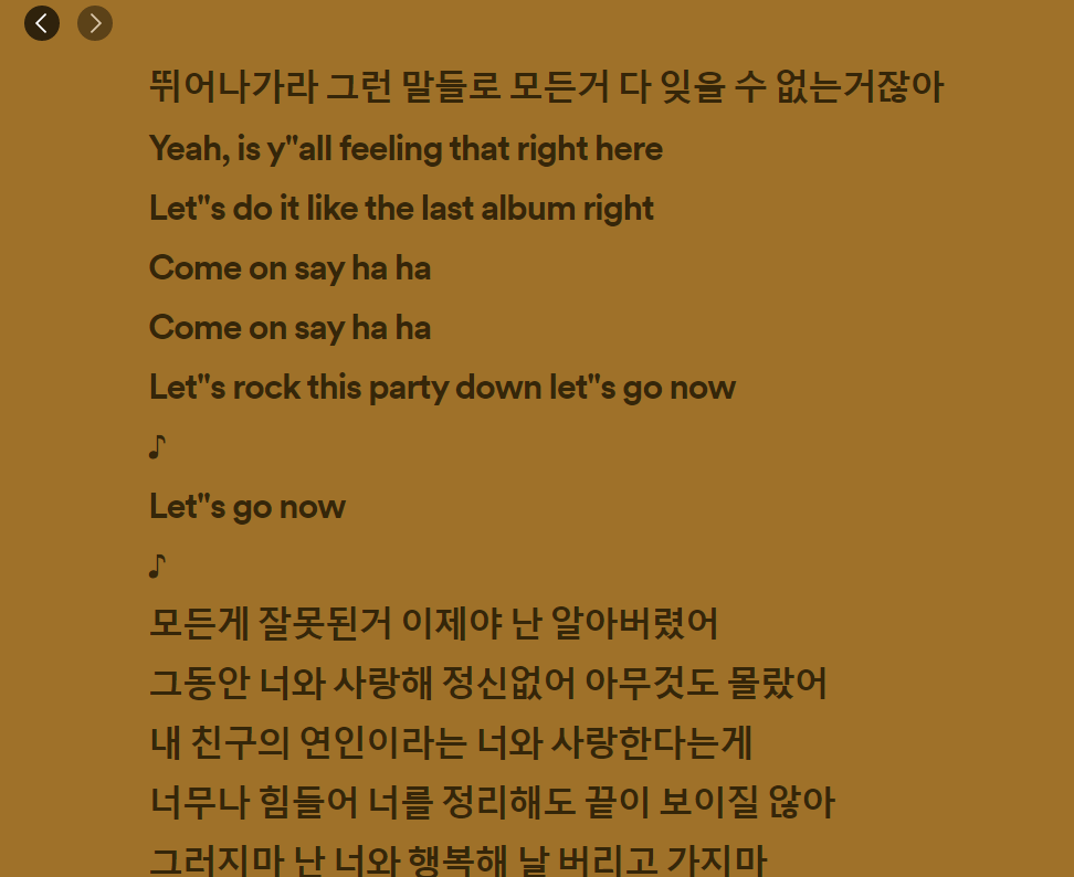 가사 좀 수정이 되었으면 좋겠습니다만 스포티파이가 대한민국 내 서비스가 아니고 유저들이 많지도 않아서 수정에는 오래 걸릴 것으로 예상이 됩니다. 이런 사소한 것들이라도 수정이 되야 저 포함 많은 유저분들이 스포티파이에 좋은 인식을 갖기 마련이지요.